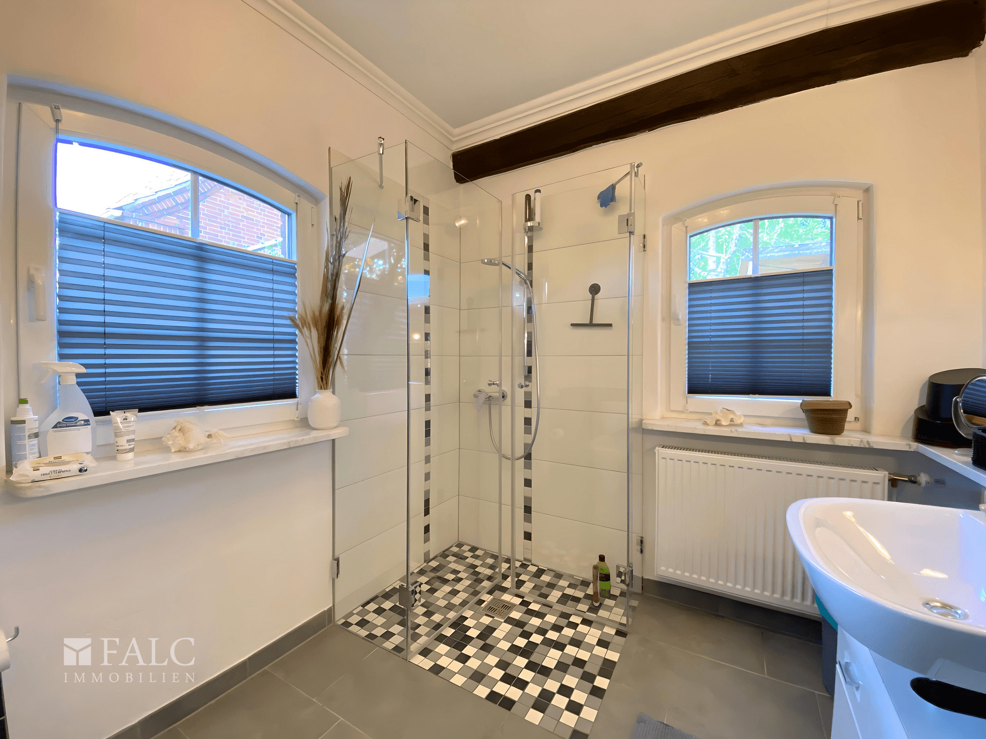 Für eine flexible Nutzung und vielseitige Wohnmöglichkeiten sorgt die Aufteilung in drei separate Wohneinheiten. Die beiden Wohneinheiten im Obergeschoss verfügen jeweils über einen eigenen Eingangsbereich und sind entweder über die West-Seite oder durch die angrenzende Werkstatt zugänglich. Jede dieser Wohnungen bietet etwa 60 Quadratmeter Wohnfläche und besteht aus einem Flur, einem Wohnzimmer, einem Schlafzimmer, einem Kinderzimmer, einer Küche und einem modernen Duschbad. Beide Wohnungen werden jeweils über separate Gasthermen beheizt, sodass eine unabhängige Steuerung der Heizung gewährleistet ist.