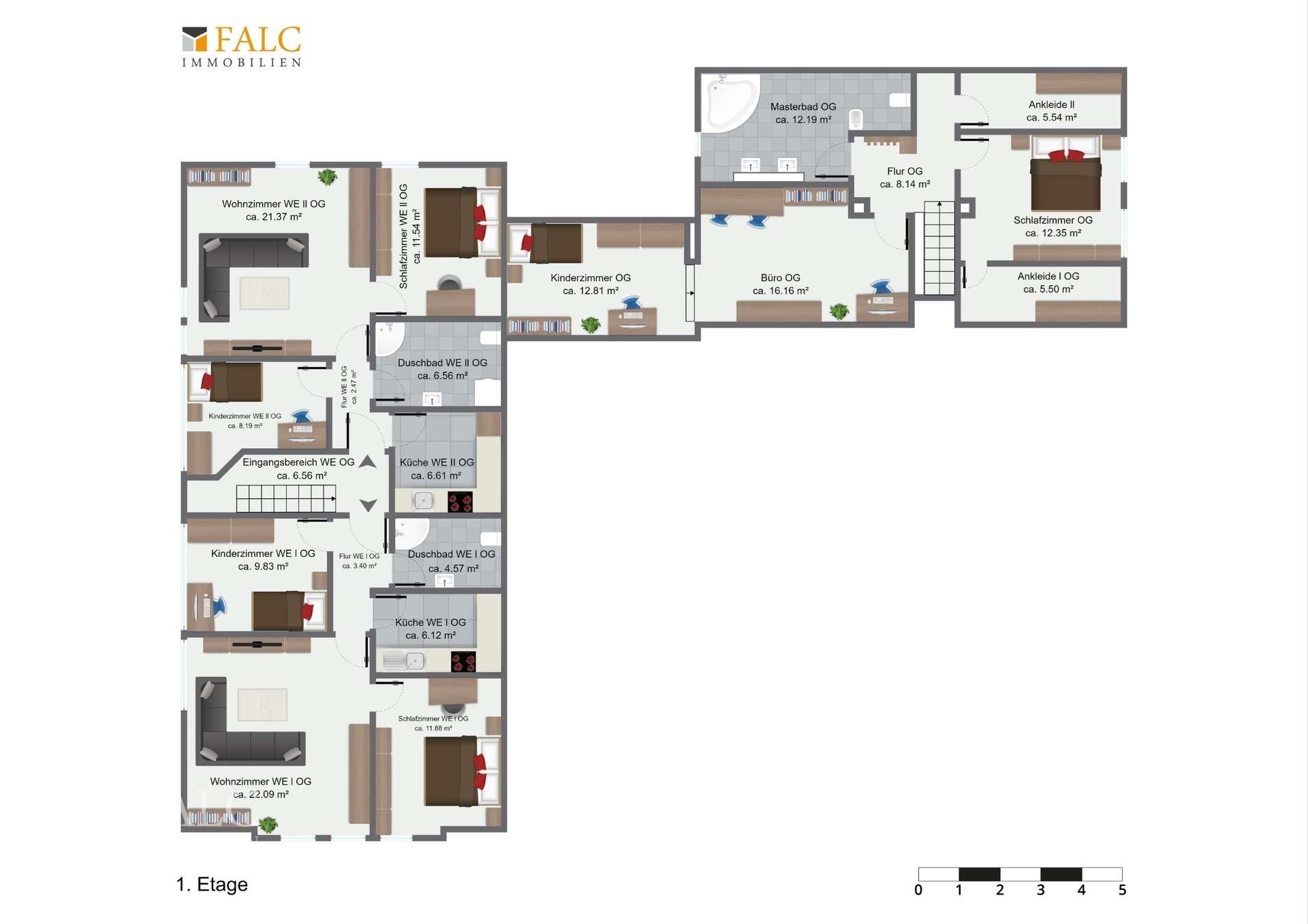 Im Obergeschoss setzt sich das großzügige Raumkonzept fort. Vom Flur aus erreicht man das Hauptschlafzimmer, das durch zwei angrenzende begehbare Ankleiden besticht. Das Masterbad ist ein luxuriöser Rückzugsort mit zwei Waschbecken, einer Badewanne und einem Bidet, das keine Wünsche offen lässt. Über das angrenzende Büro gelangt man direkt in das helle und freundliche Kinderzimmer – ideal für eine Familie, die Wert auf eine sinnvolle Raumaufteilung legt.