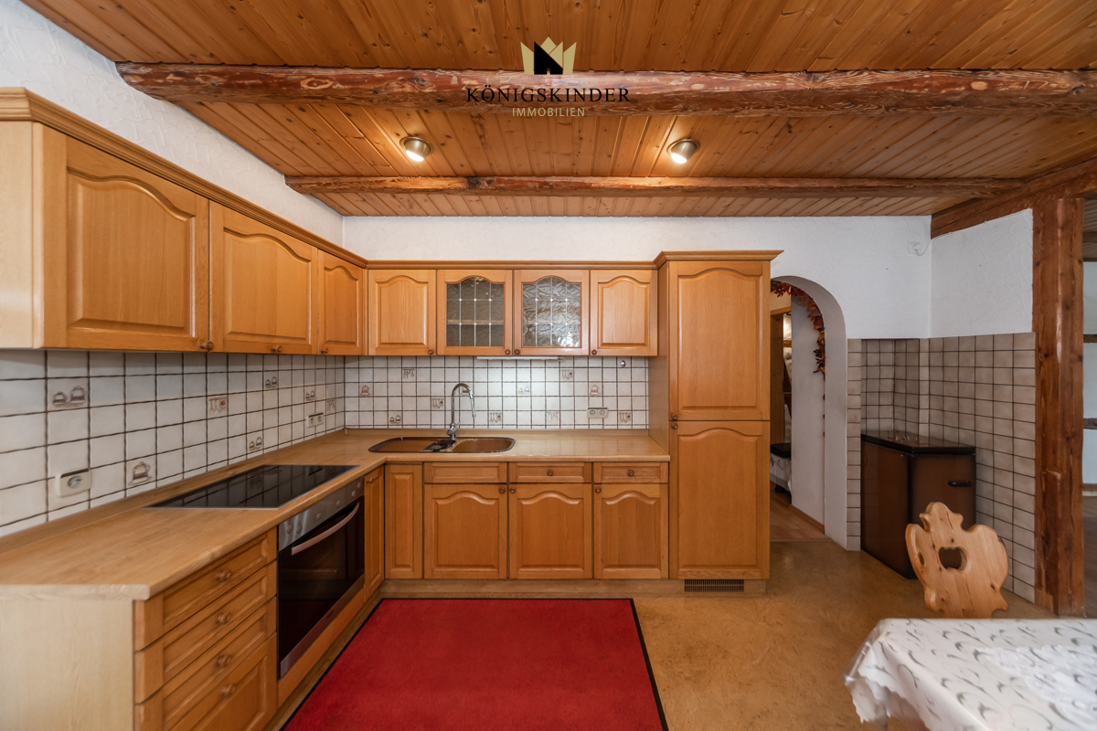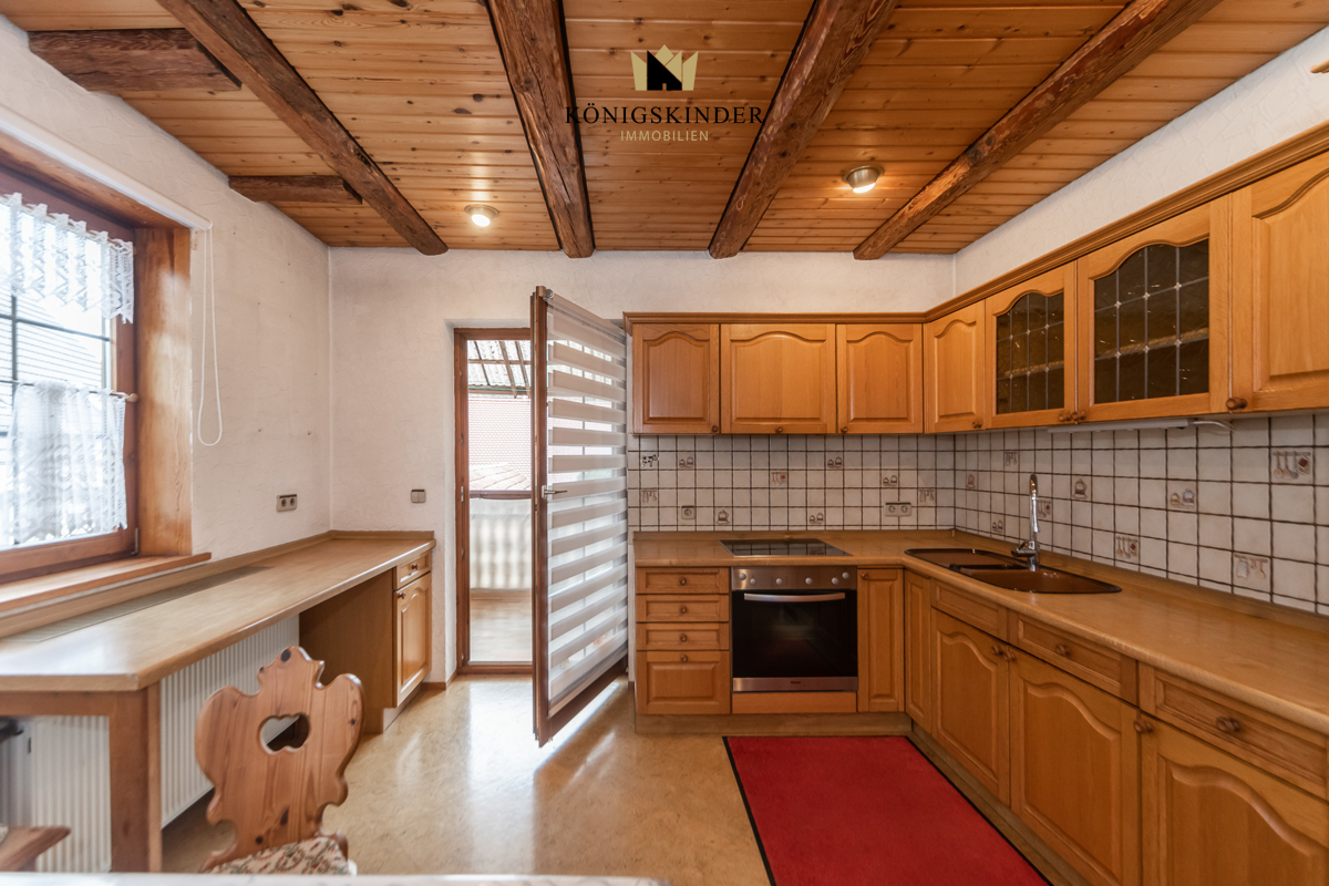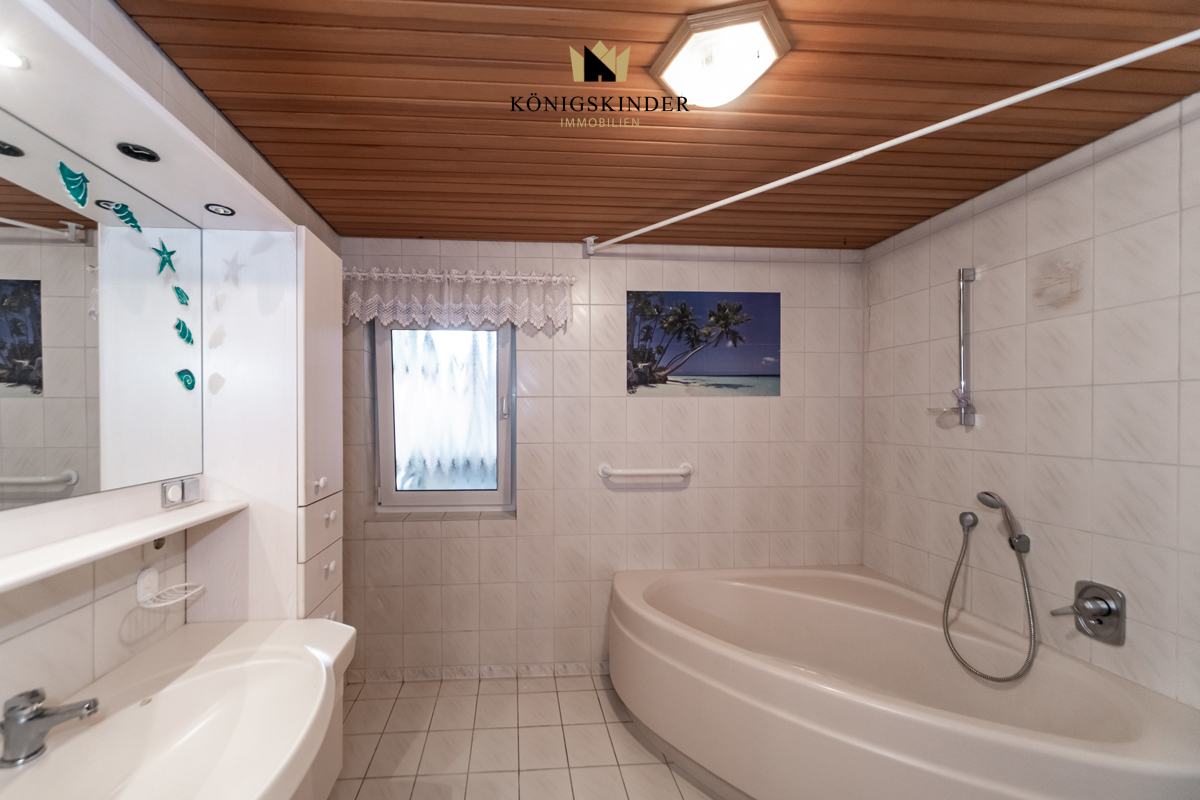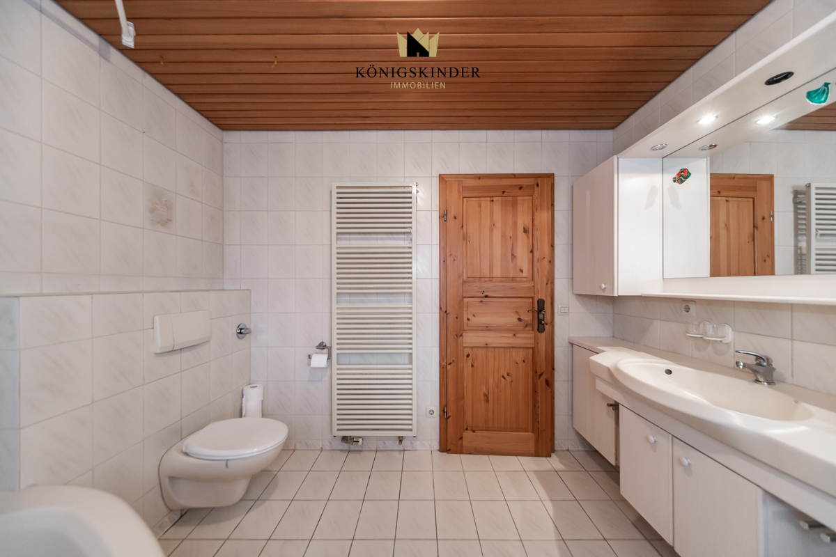 Im Obergeschoss befindet sich das Wohnzimmer, die großzügige Küche mit Balkon und das Tageslichtbad mit großer Badewanne.