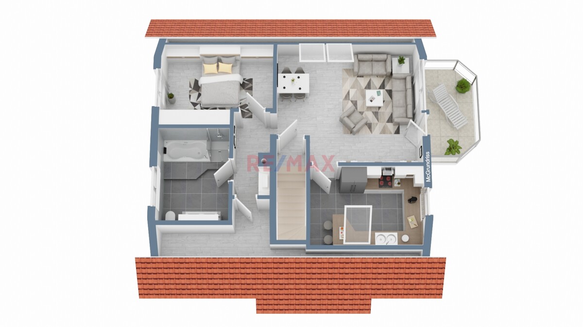 Das Obergeschoss, welches seperat nutzbar ist, besteht aus einem Schlafzimmer, einer Essküche, einem Wohnzimmer, einem Tageslichtbad mit Dusche und Wanne, einem Abstellraum sowie einem Balkon.