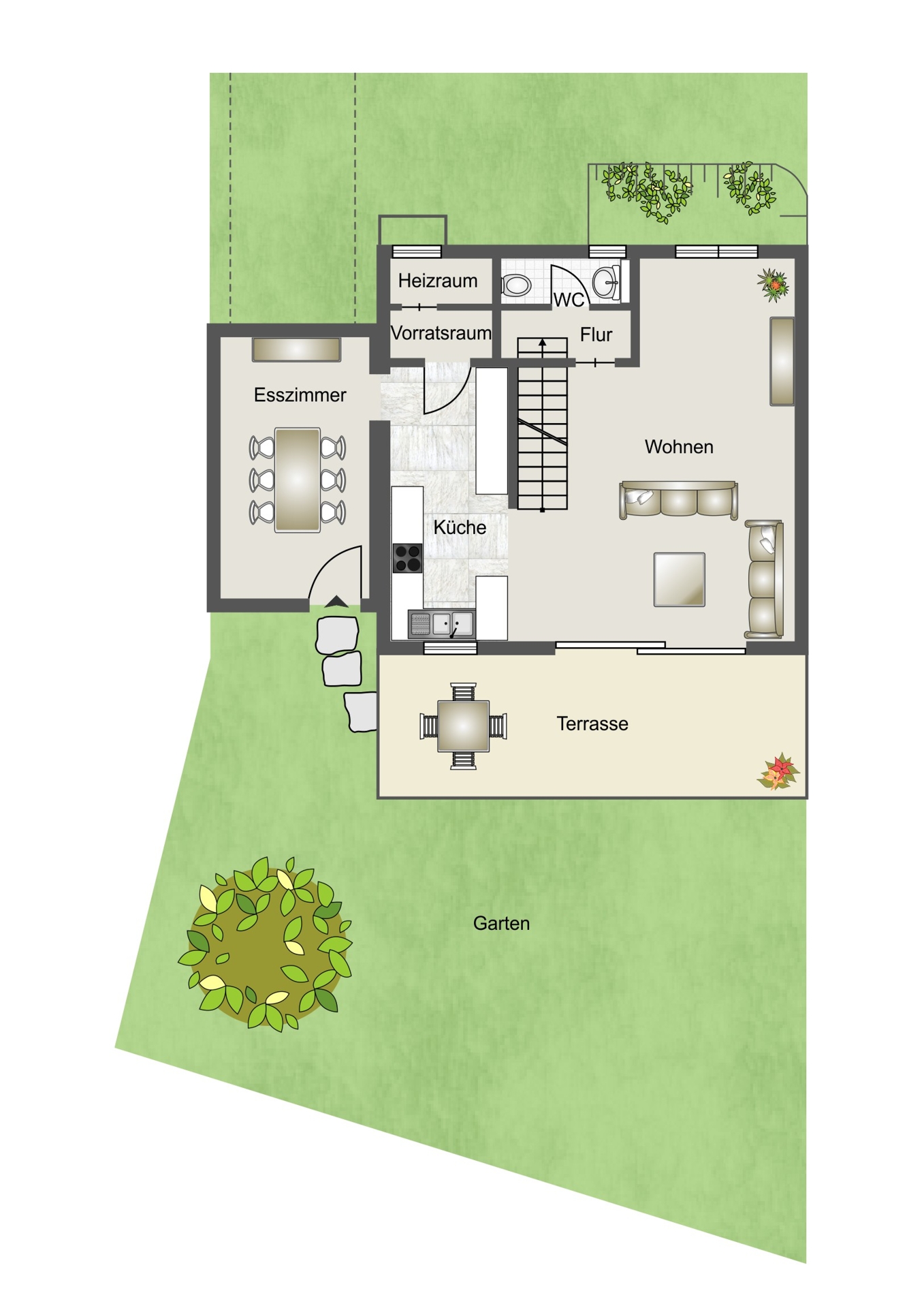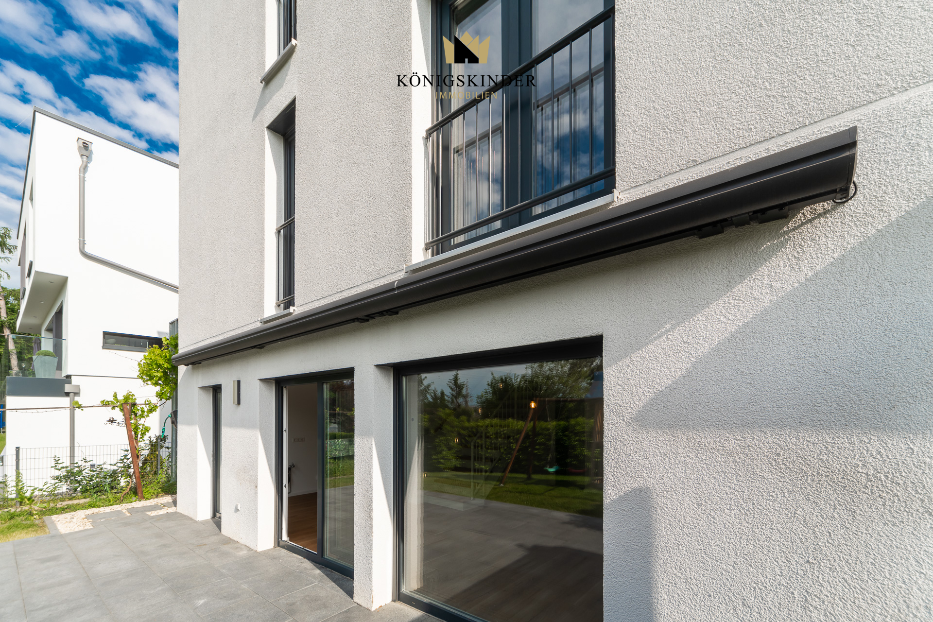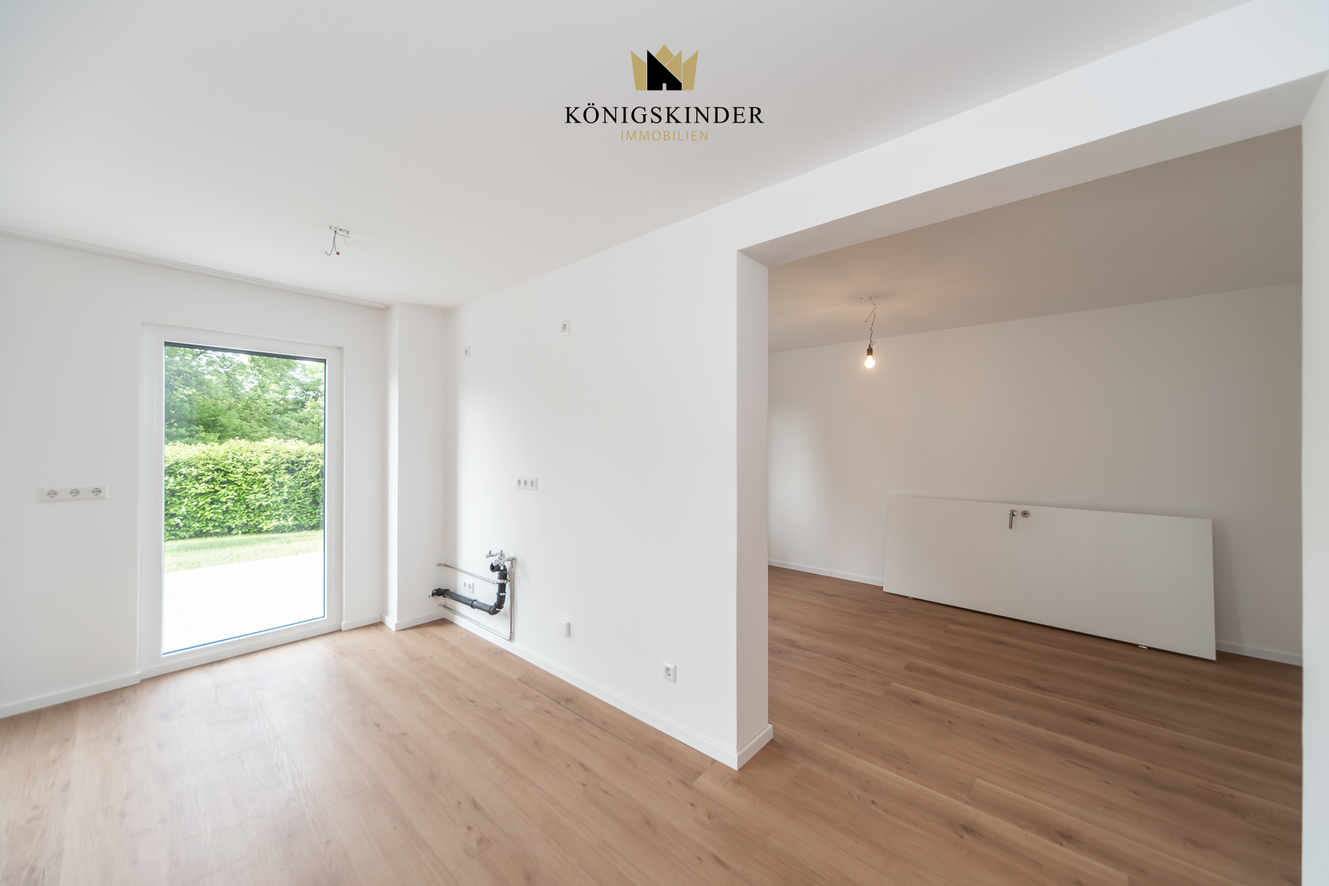 Im Untergeschoss eröffnet sich das Herzstück des Hauses: ein weitläufiger Wohn- und Essbereich mit offener Küche. Bodentiefe Fenster sorgen für viel Tageslicht und schaffen einen fließenden Übergang zur Terrasse, die sowohl vom Wohn- als auch vom Esszimmer aus zugänglich ist. Hier lassen sich warme Sommertage in ruhiger, geschützter Atmosphäre genießen.