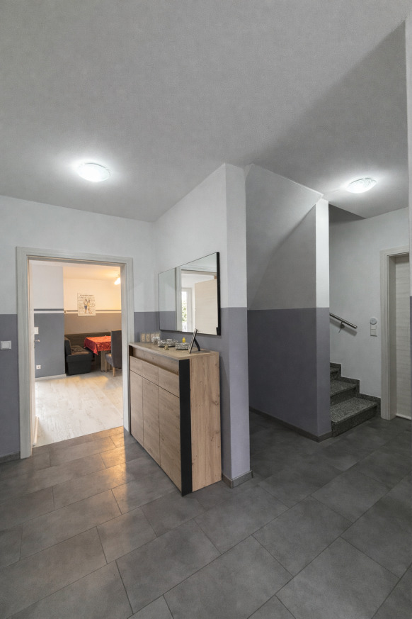 Ein Schlafzimmer sowie ein Duschbad im Erdgeschoss ermöglichen komfortables Wohnen auf einer Ebene – ideal für Gäste, Homeoffice oder perspektivisch altersgerechtes Wohnen. Ergänzt wird diese Ebene durch einen gut dimensionierten Hauswirtschaftsraum mit praktischem Zugang zur großen Garage sowie zum Garten.