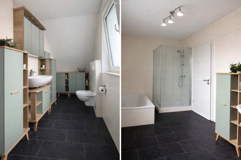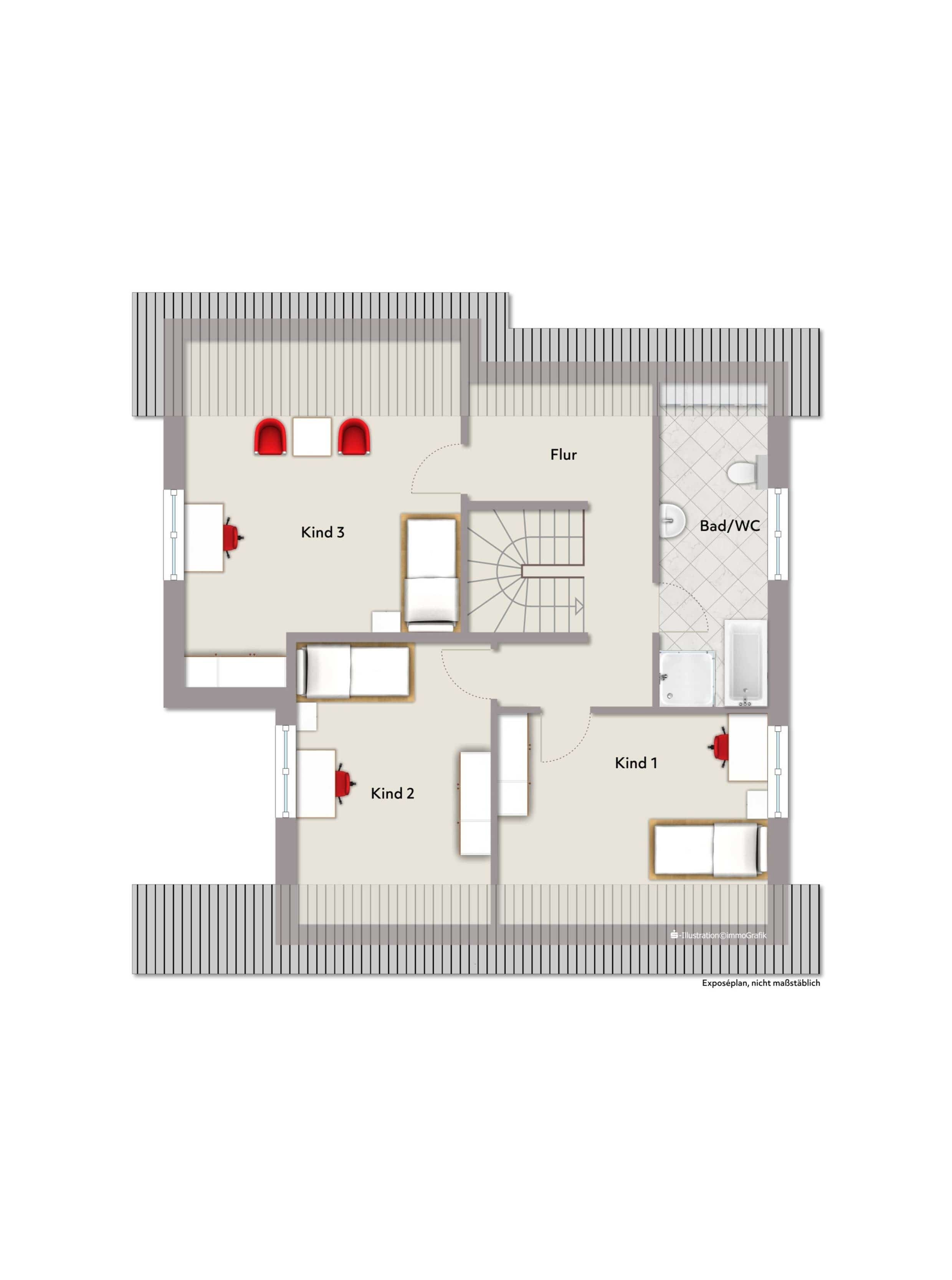 Im Dachgeschoss befinden sich drei großzügige Schlafzimmer und das moderne Familienbad mit Dusche und Badewanne – optimal auf die Bedürfnisse einer Familie abgestimmt.