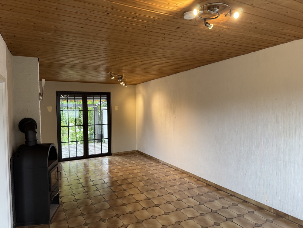 Der Eingangsbereich führt, vorbei am Treppenhaus, in den Flur, der alle Räume erschließt. Links befindet sich das Gäste-WC, rechts das große Wohn-/Esszimmer mit Kaminofen und Einbauküche sowie Zugang zum Garten mit angeschlossem Nebengebäude (Holz-Ständerwerk).