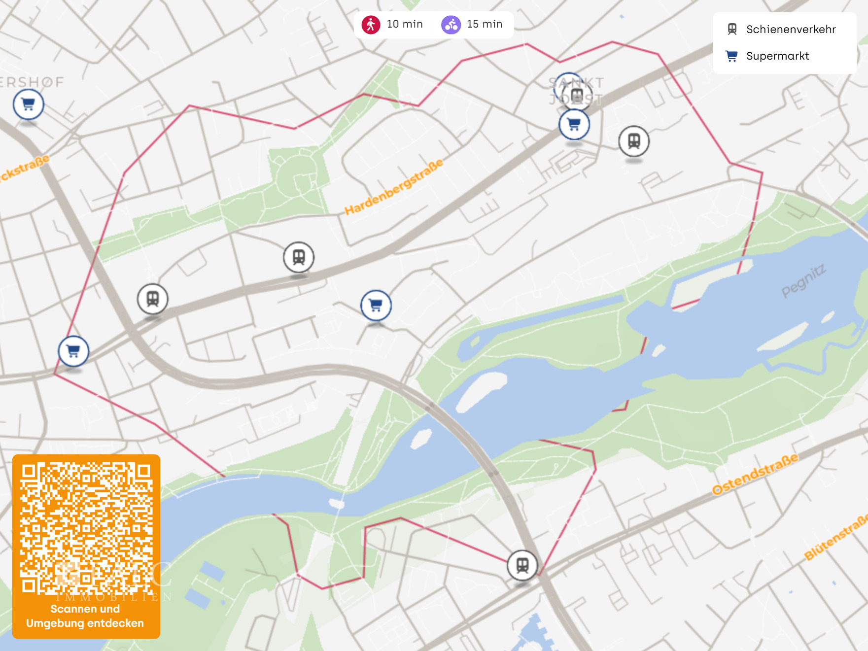 Auch für Familien ist die Lage attraktiv: Mehrere Schulen und Bildungseinrichtungen, darunter Montessori- und Waldorfschule, befinden sich im näheren Umfeld. Ergänzt wird das Angebot durch eine vielfältige Auswahl an Cafés und Restaurants, die überwiegend fußläufig erreichbar sind.