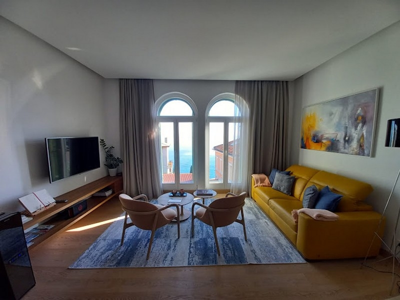 Die Wohnung ist stilvoll eingerichtet und sie bietet einen wunderschönen Blick auf das Meer.