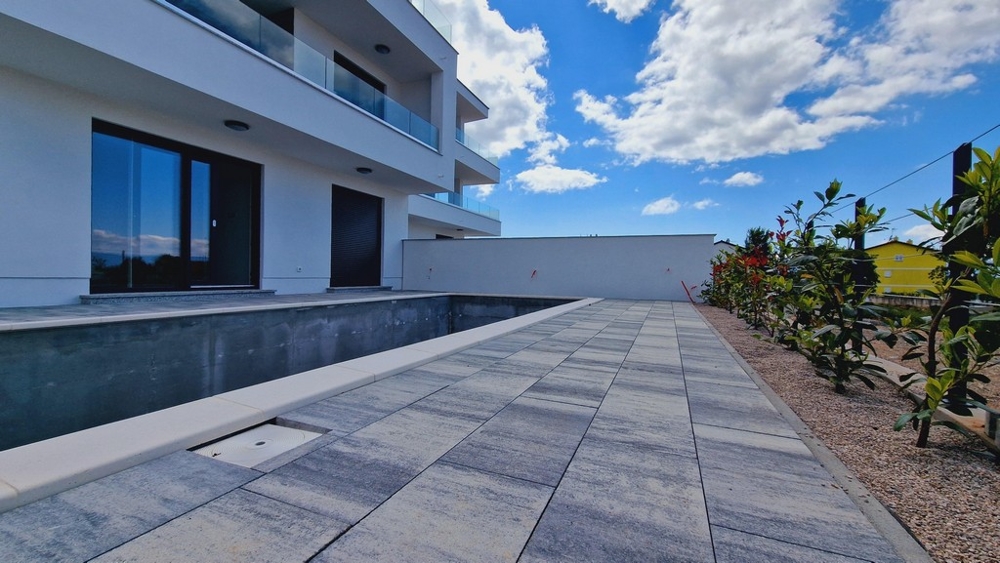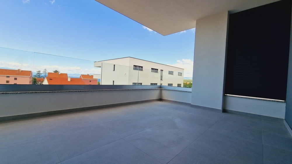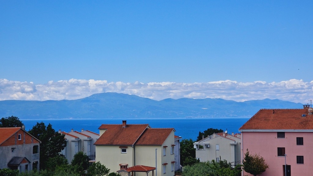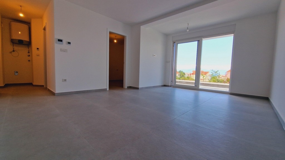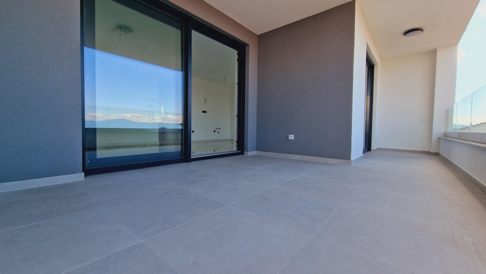 Zum einen ein Appartement mit Meerblick im ersten Stock mit einer Wohnfläche von 78,50 m² und zwei Schlafzimmern, einem Bad, Toilette, Wohnzimmer mit Essbereich und Küche sowie einer großen Terrasse.
