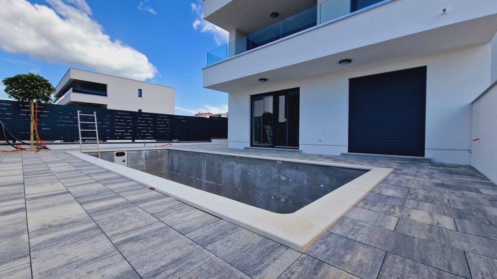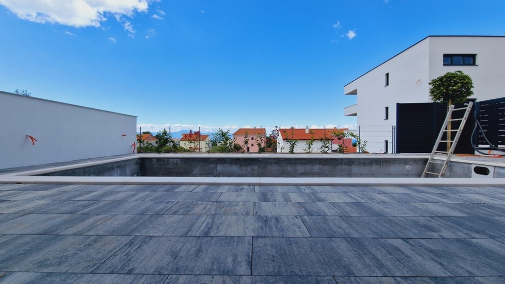 Zum anderen ein Appartement im Erdgeschoss mit Garten und Swimmingpool und einer Wohnfläche von 46,09 m² mit einem Schlafzimmer, einem Badezimmer, Wohnzimmer mit Essbereich und Küche.