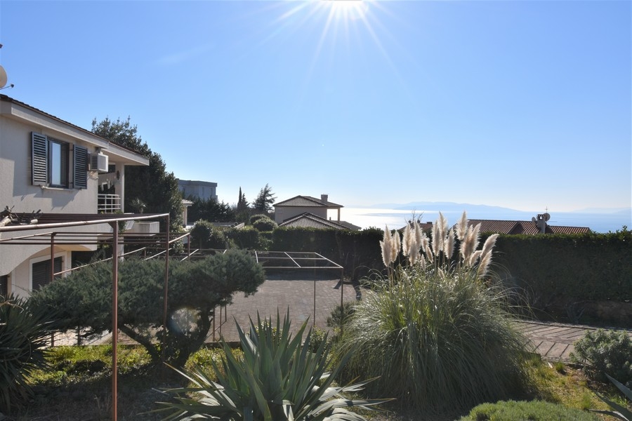 Vom Wohnzimmer gelangt man auf den überdachten großen Balkon mit traumhaftem Blick auf die Kvarner Bucht.