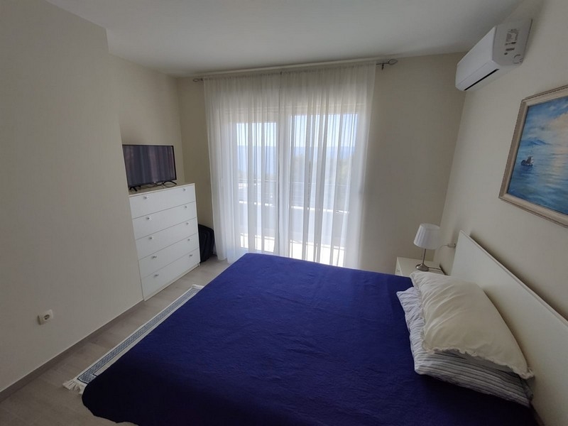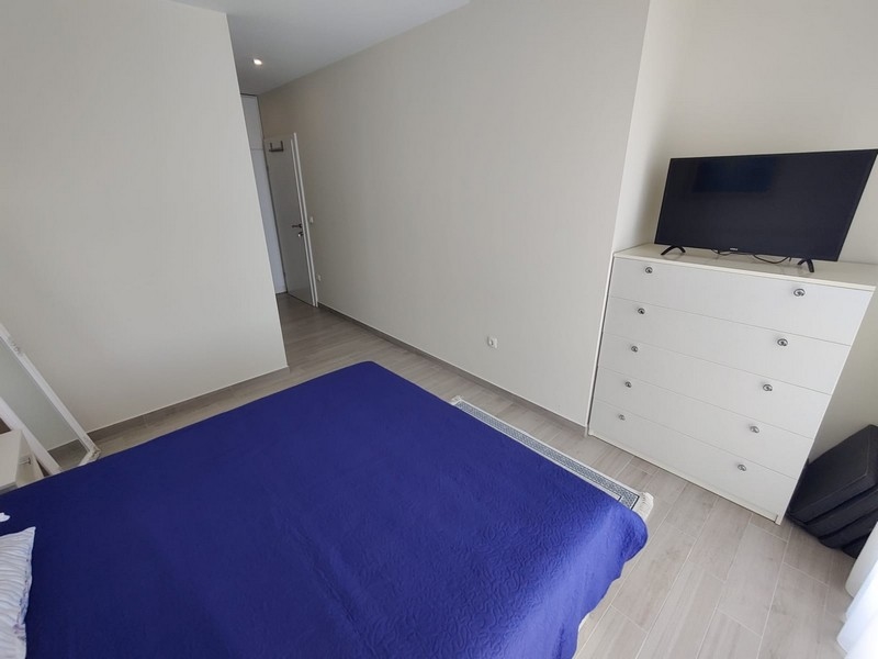 Zweiter Stock: Einzimmerwohnung mit Schlafzimmer, Badezimmer, Küche mit Essbereich und geräumigem Wohnzimmer mit Südbalkon und Meerblick.