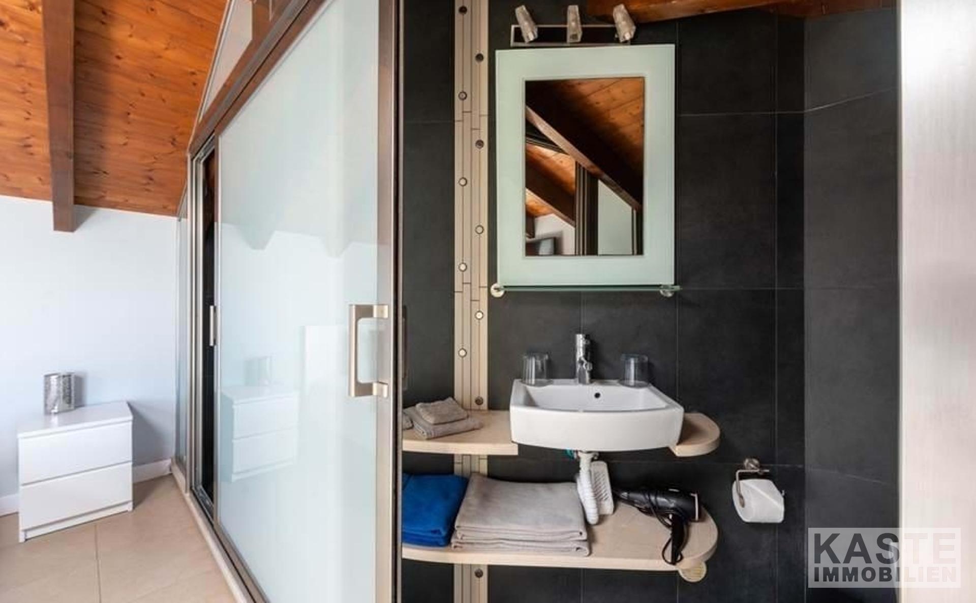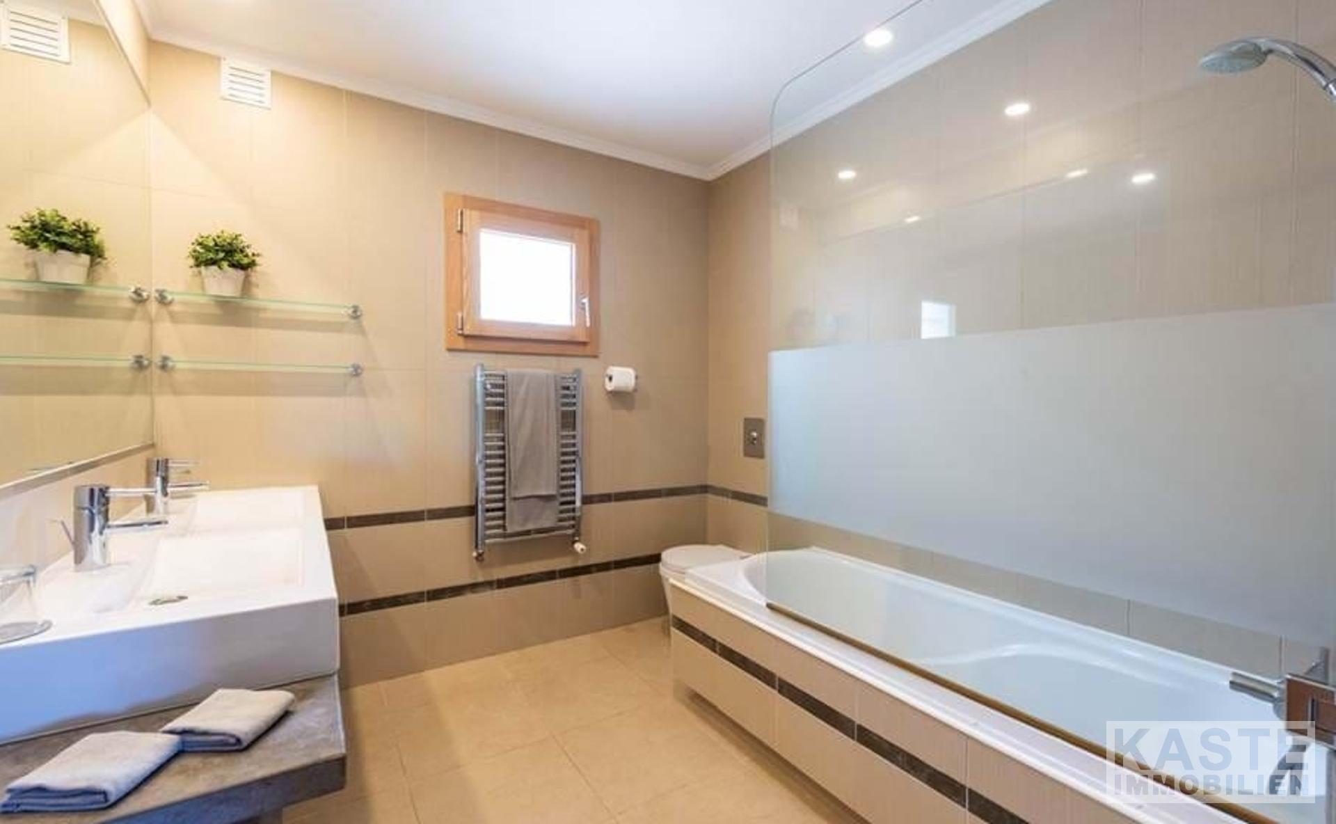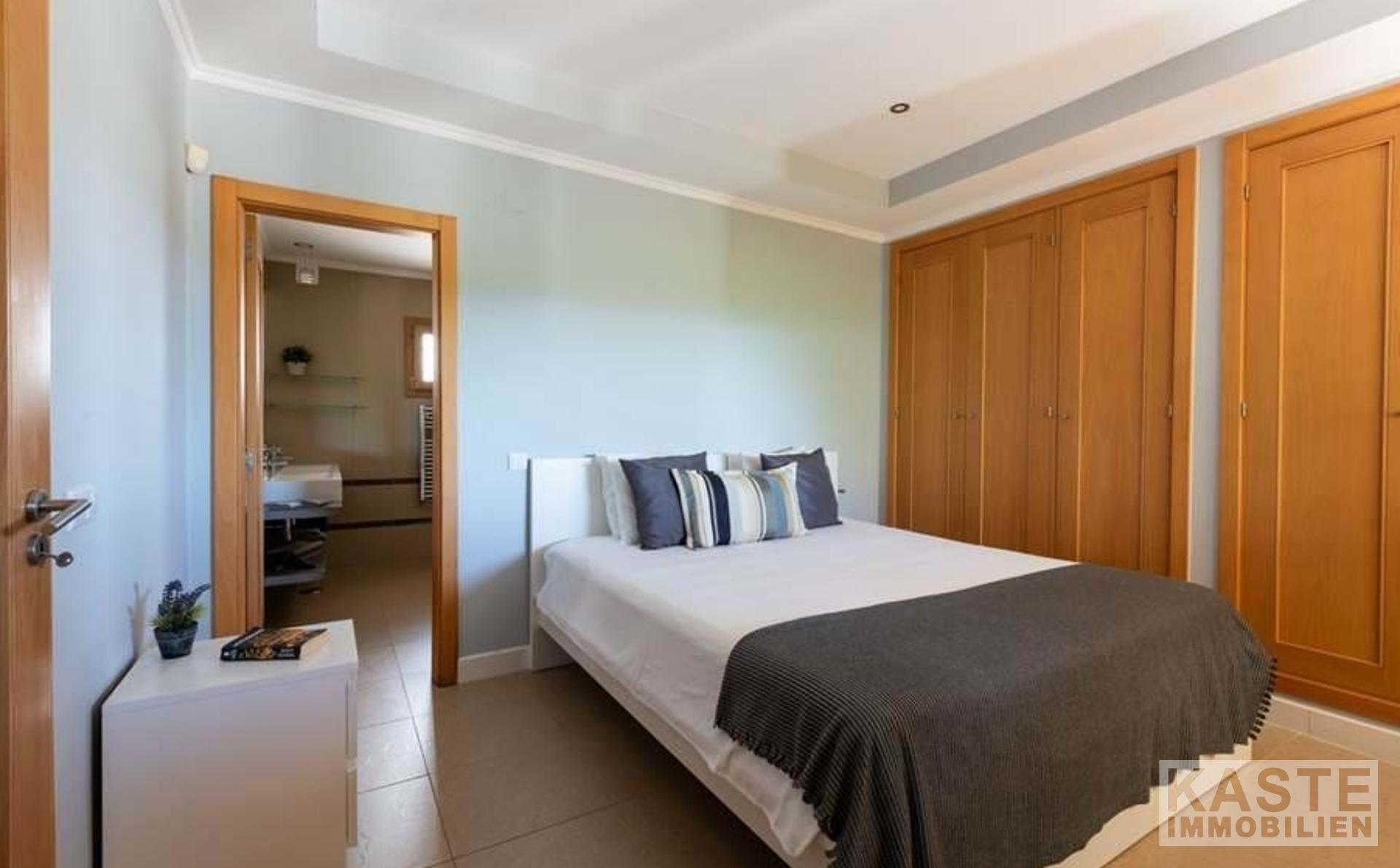 Ein weiterer Vorteil ist die Möglichkeit, den Pool kostengünstig zu beheizen und somit das ganze Jahr über zu nutzen. Das Highlight des Anwesens ist das beeindruckende Hauptschlafzimmer im Obergeschoss, das nicht nur durch seine Großzügigkeit und hochwertige Ausstattung besticht, sondern auch einen unvergleichlichen Blick auf das Meer bietet – ein Anblick, den Sie direkt vom Bett aus genießen können.