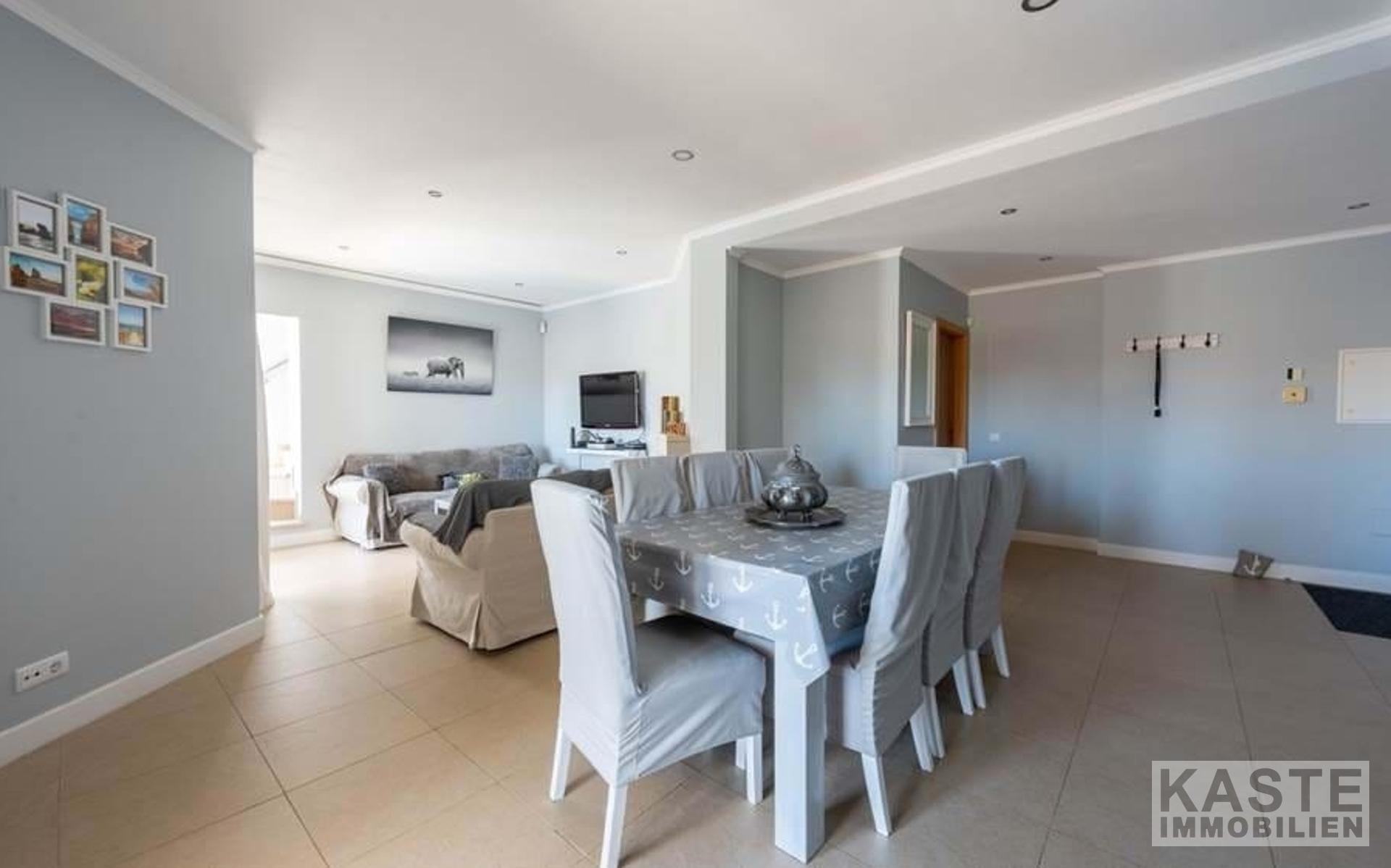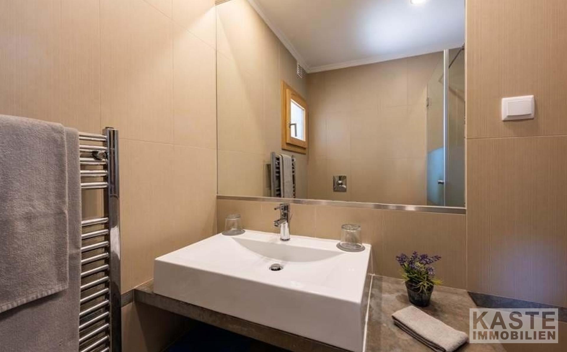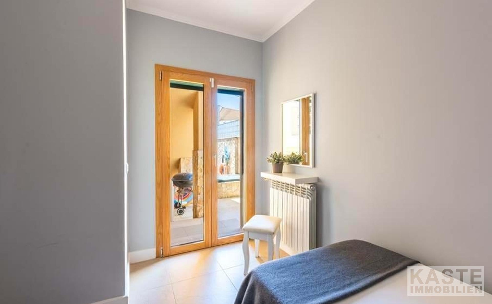 Die geräumige Garage mit angrenzendem Hauswirtschaftsraum lässt sich flexibel nutzen, beispielsweise als Heimkino oder Spielzimmer, während dennoch Platz für drei Autos bleibt. Das Haus ist mit einer modernen Solaranlage zur Warmwasserbereitung sowie hochmodernen Photovoltaikmodulen ausgestattet, die Strom zurück in das Hausnetz einspeisen. Diese nachhaltige Technik verleiht der Villa die Energieeffizienzklasse A.