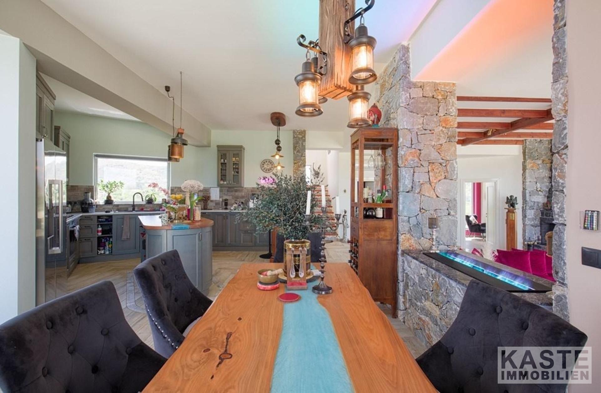 Der lichtdurchflutete Wohnbereich bildet das Herzstück des Hauses und verbindet sich harmonisch mit der hochmodernen, voll ausgestatteten Küche – ideal für kulinarische Entfaltung. Durch den offenen Grundriss werden fließende Übergänge ermöglicht, während große Fenster und Schiebetüren den Blick auf den Außenbereich freigeben. Der 79 m² große Pool lädt zum Schwimmen und Entspannen ein und bietet eine perfekte Kulisse, um die Ruhe der Umgebung zu genießen.