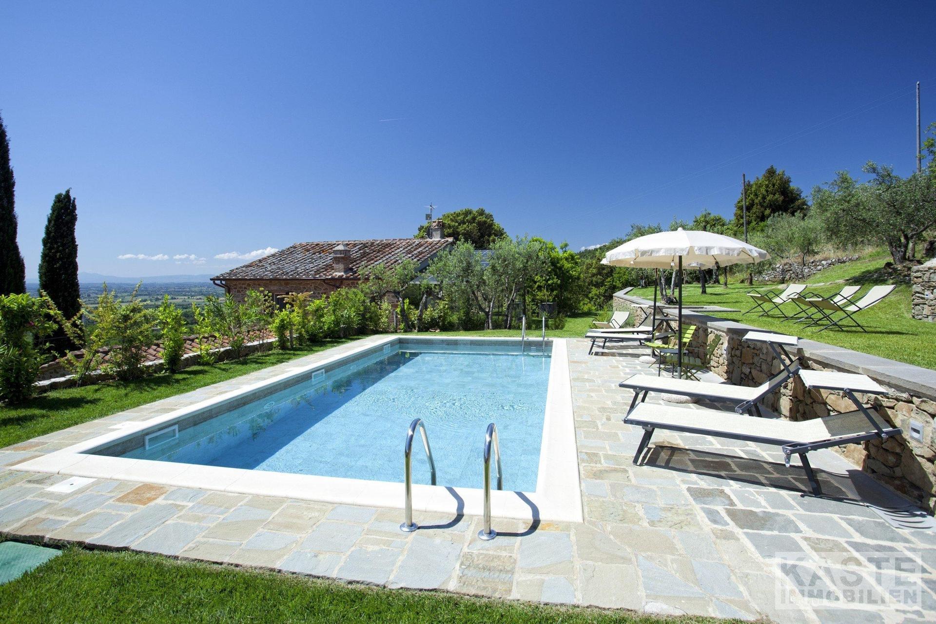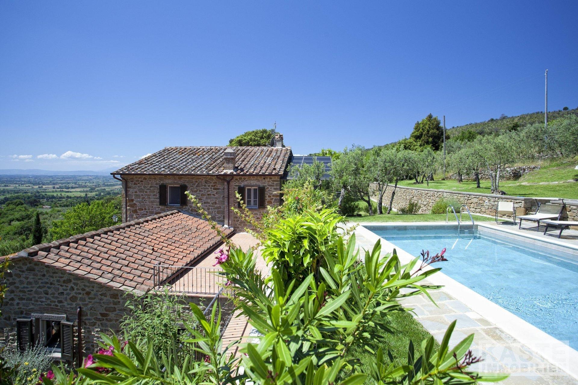 Die wunderschöne Villa, ein beeindruckendes toskanisches Steinhaus aus dem 18. Jahrhundert, liegt nur 2,5 km von Cortona entfernt inmitten malerischer Olivenhaine. Dieses charmante Anwesen wurde kürzlich umfassend renoviert und stilvoll eingerichtet, um modernen Komfort mit traditioneller Eleganz zu verbinden. Dank ihrer nach Süden ausgerichteten Lage bietet die Villa einen herrlichen Blick über das Tal und eine idyllische Ruhe, ideal für entspannte Spaziergänge auf den umliegenden Wanderwegen.