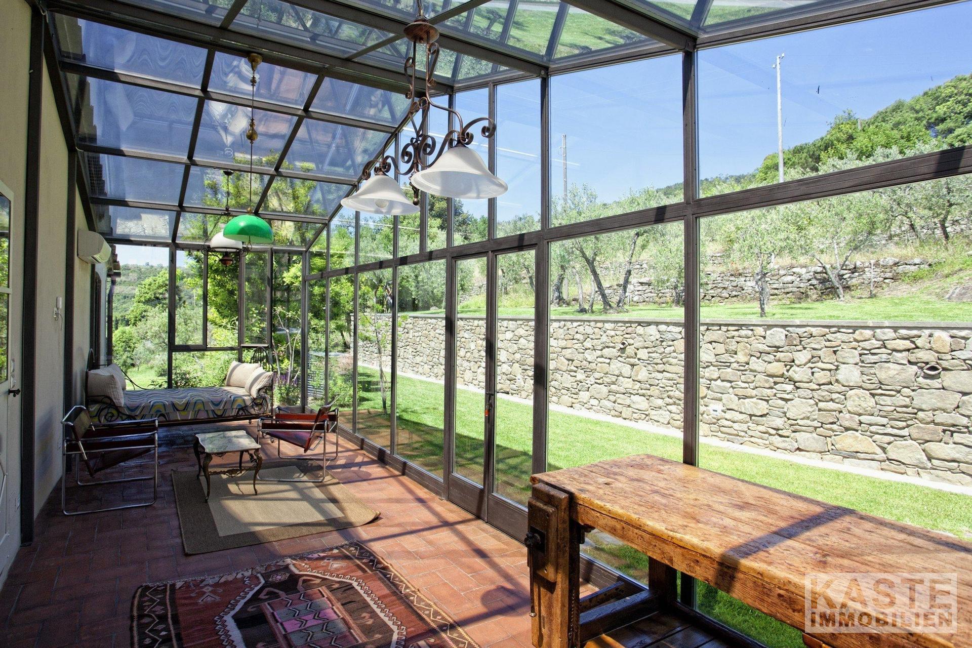 Ein besonderes Highlight ist der stilvolle Wintergarten aus Eisen und Isolierglas. Dieser einladende Raum bietet eine perfekte Umgebung, um tagsüber zu entspannen oder den Abend in Ruhe ausklingen zu lassen. Innenraumgestaltung und Raumaufteilung