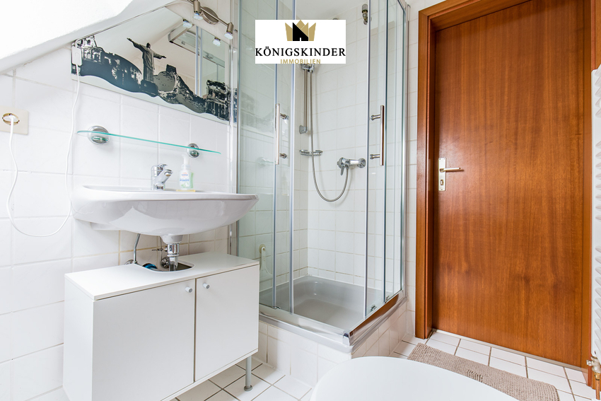 Zwischen dem Schlafzimmer und dem Wohn- / Esszimmer befindet sich auf der linken Seite das Tageslichtbad mit Dusche und WC.