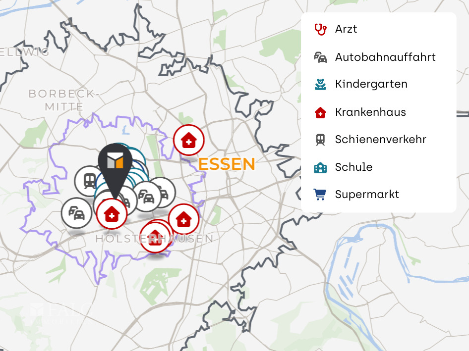 Die Anbindung an den öffentlichen Nahverkehr ist komfortabel: Die Bushaltestelle Gervinusstraße ist in ca. 200 m erreichbar, weitere Haltepunkte wie Rüdesheimer Platz liegen ebenfalls in der Nähe. Für die Schiene bieten sich mehrere Stationen im Umfeld an, darunter Wickenburgstraße sowie Essen-Frohnhausen, jeweils in etwa einem Kilometer Entfernung. Wer mit dem Auto unterwegs ist, erreicht die nächste Autobahnauffahrt in ca. 700 m, was schnelle Verbindungen in die Essener Innenstadt und in die umliegenden Städte ermöglicht.