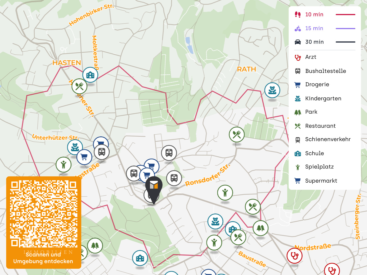 Die Eigentumswohnung befindet sich in zentraler und zugleich gut angebundener Lage von Remscheid, im Stadtteil Hasten. Die Hastener Straße zeichnet sich durch eine gewachsene Infrastruktur sowie eine angenehme Mischung aus Wohn- und Geschäftsbebauung aus.