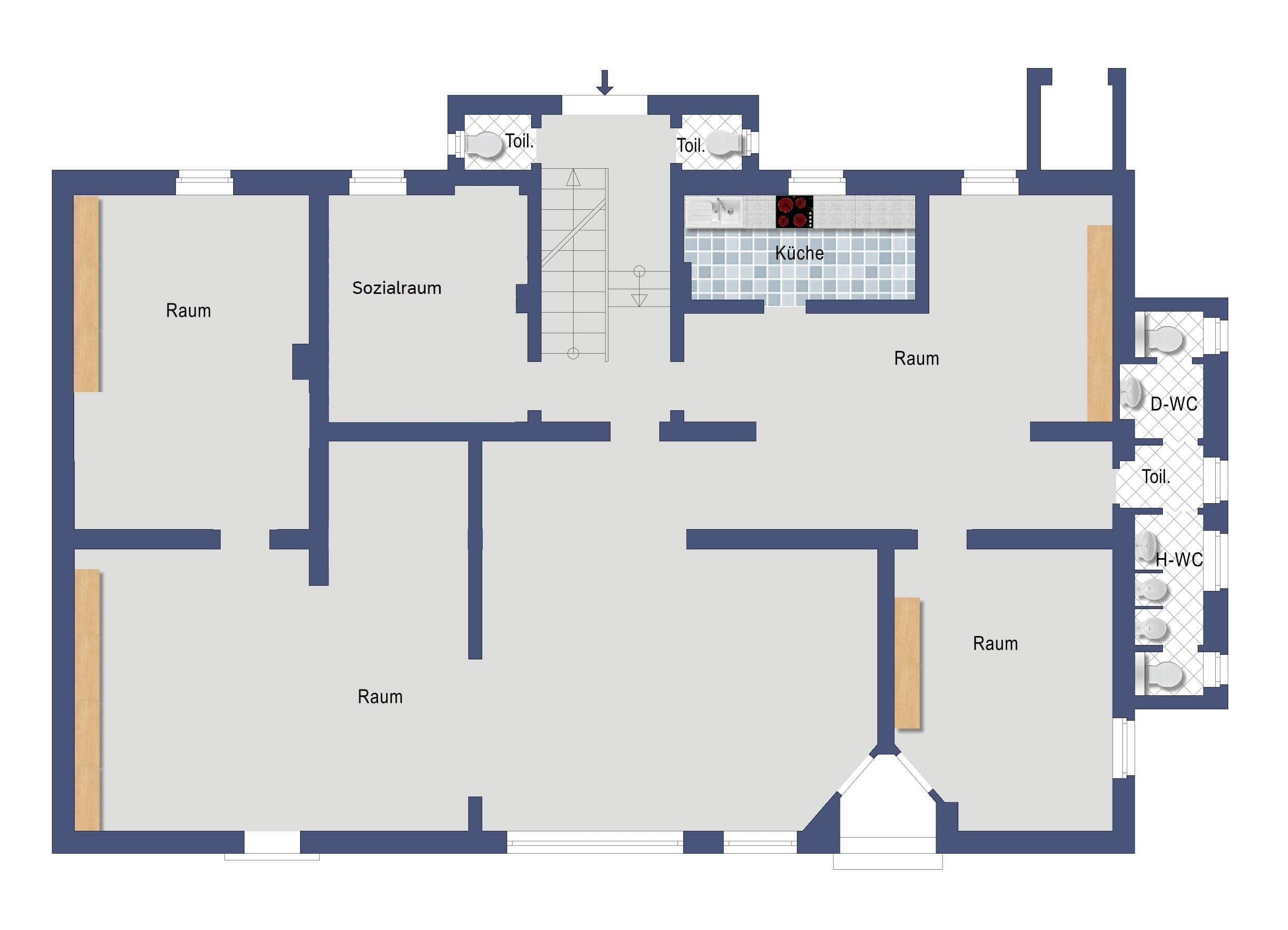 Im Erdgeschoss befinden sich 3 Gewerbeeinheiten, die derzeit komplett an ein Versicherungsbüro vermietet sind.