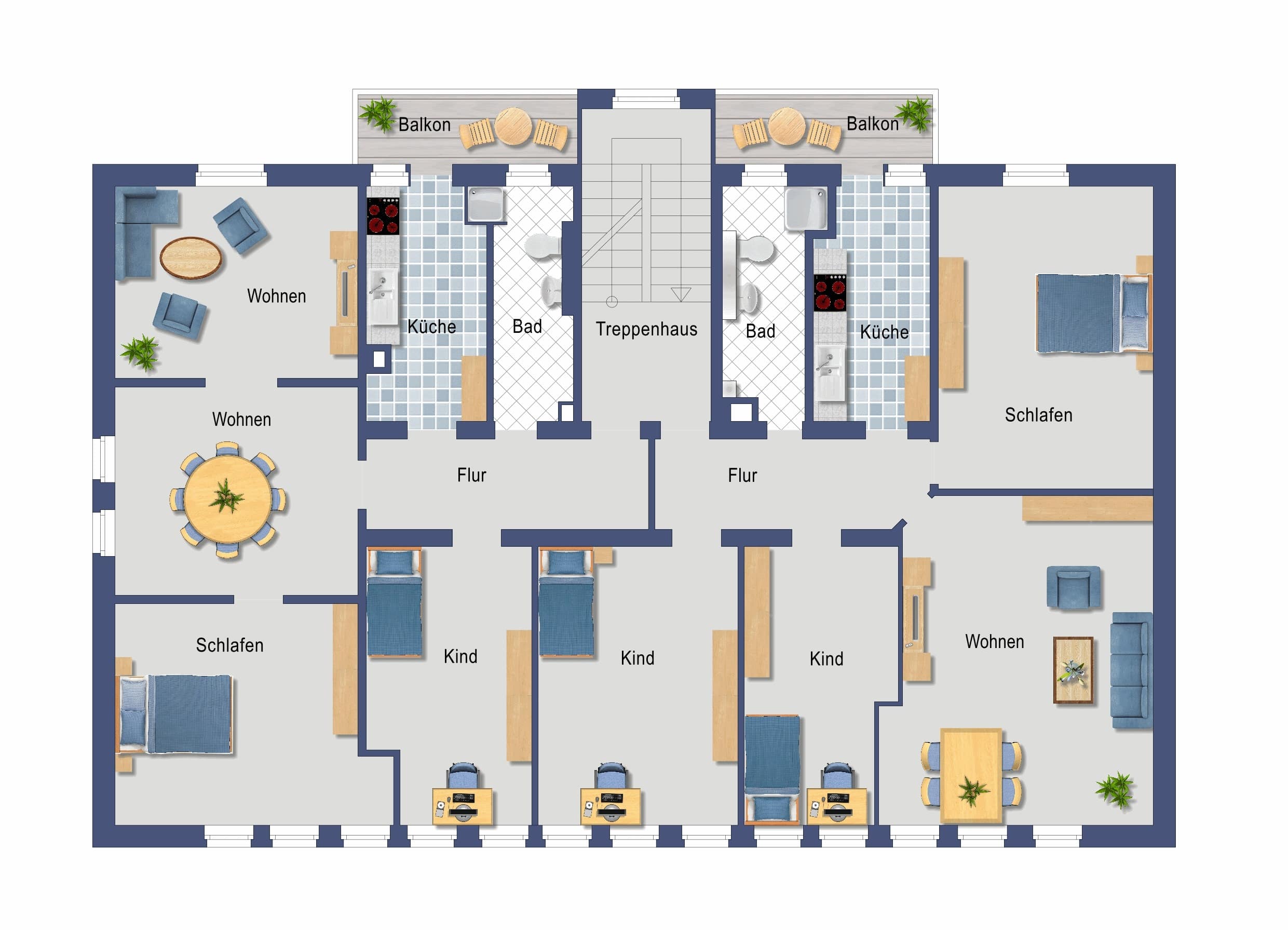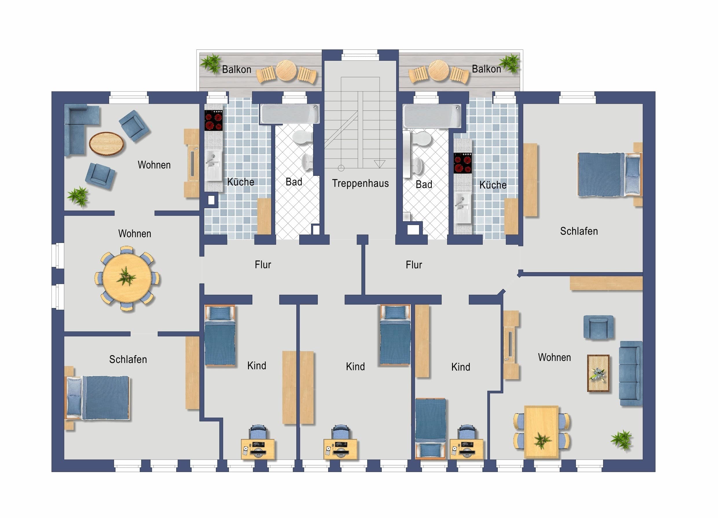 Die 6 Wohneinheiten verteilen sich auf die beiden Obergeschosse und das Dachgeschoss.