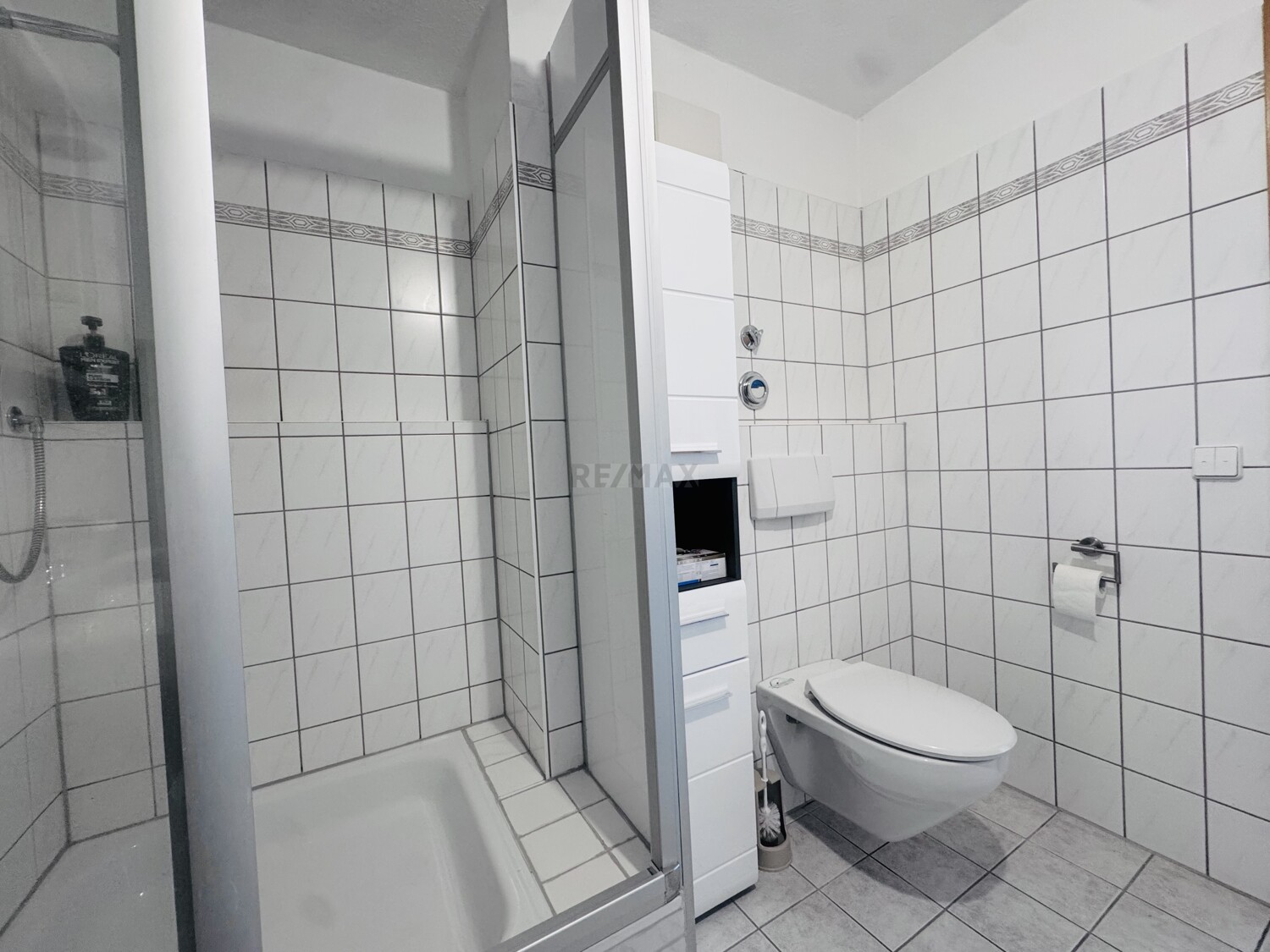 Das großzügige Badezimmer ist mit einer Dusche sowie einem WC ausgestattet. Hier finden sowohl Waschmaschine als auch Trockner bequem ihren Platz.