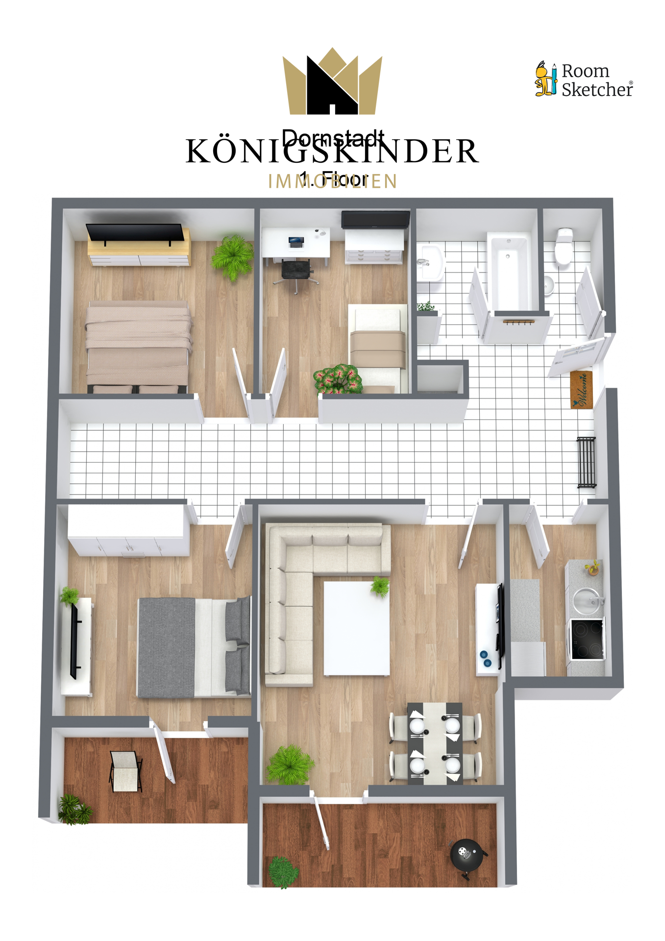 - Böden sind aus Vinyl, Korkboden und Fließen
