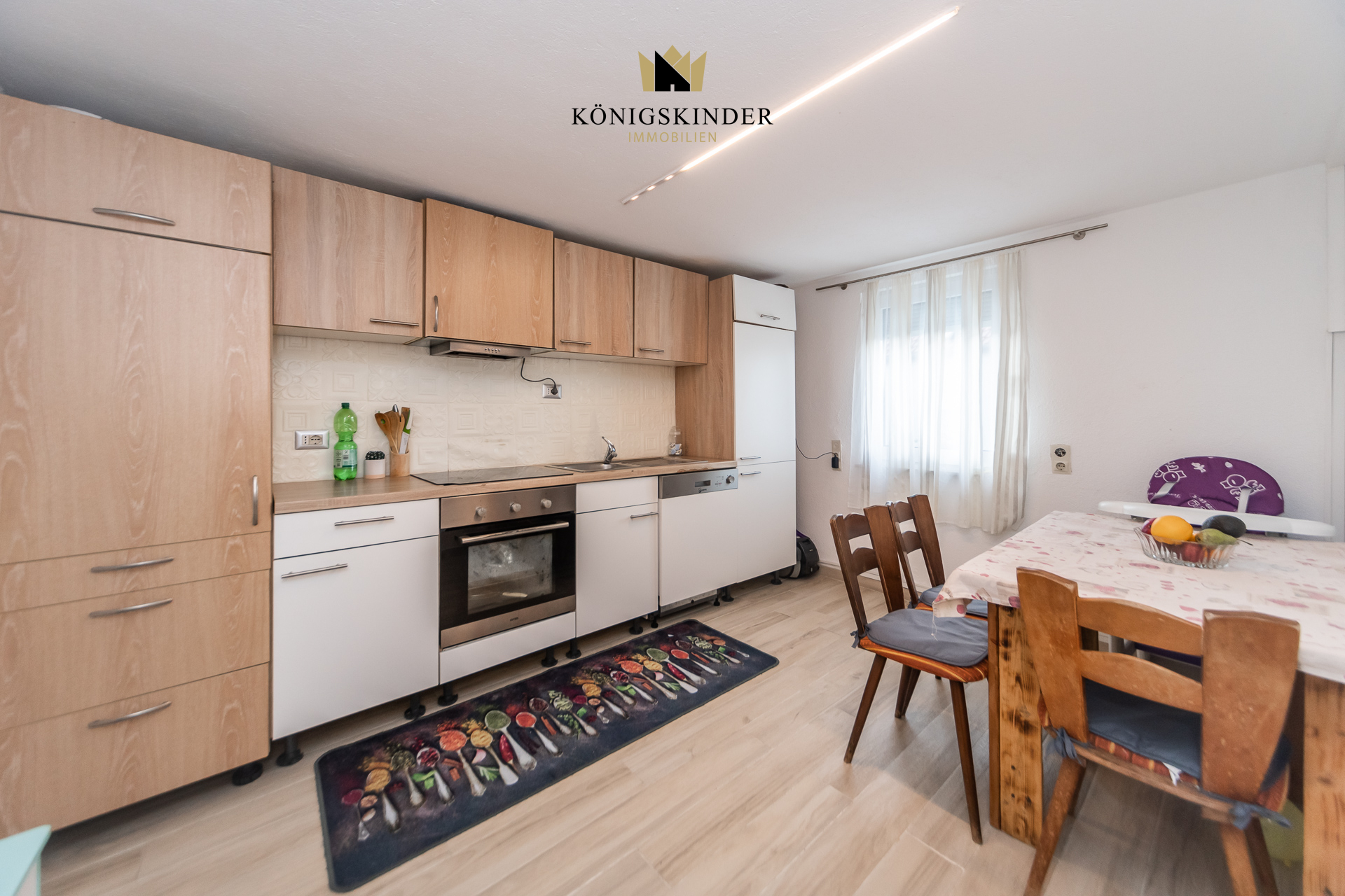 Die gepflegte Einbauküche bietet optimale Voraussetzungen für den täglichen Kochkomfort. Zusätzlich stehen ein gemütlicher Hobbyraum sowie praktische Nebenflächen zur Verfügung, die vielfältige Nutzungsmöglichkeiten eröffnen.
