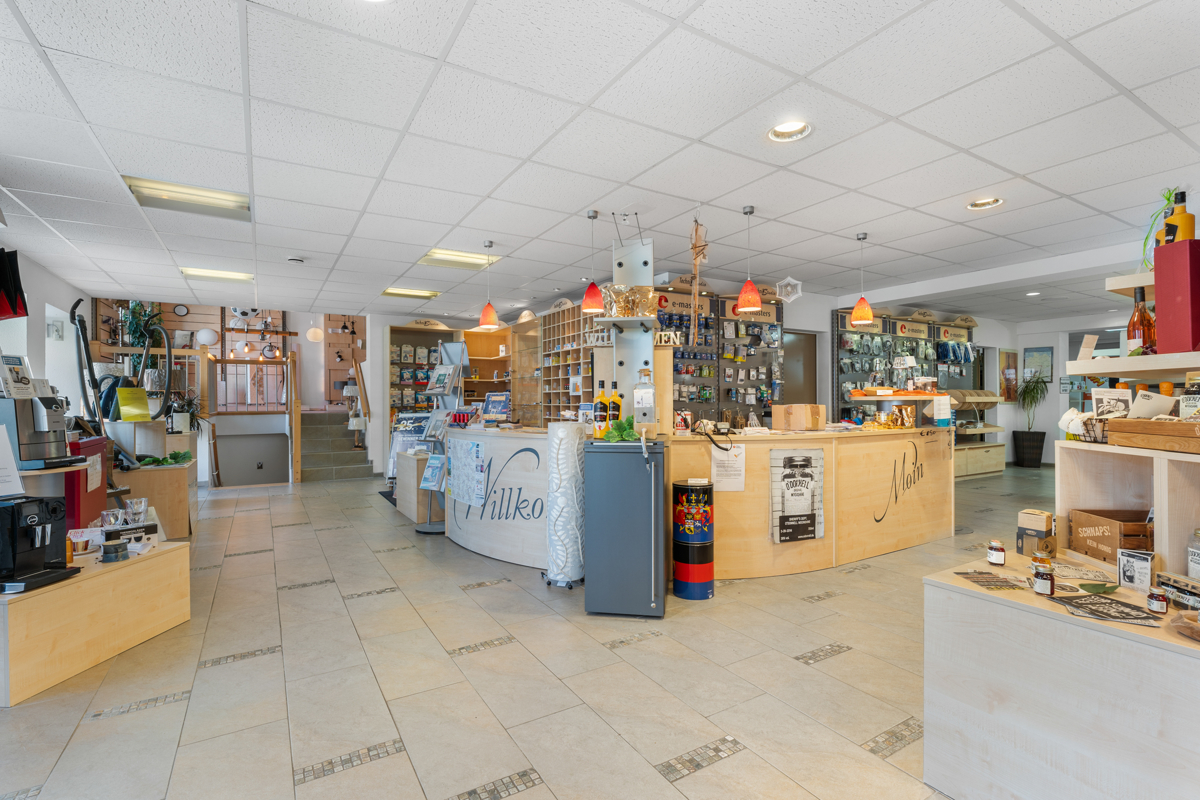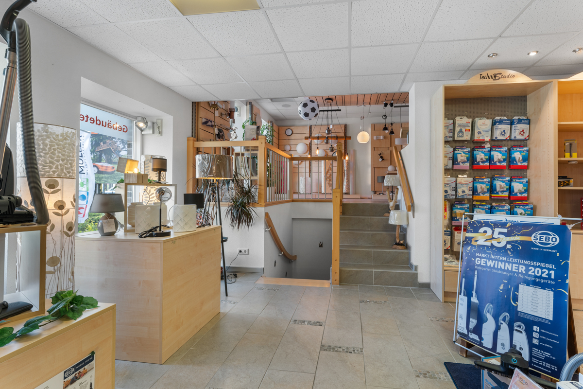 Erdgeschoss: Beim Betreten durch den Haupteingang eröffnet sich Ihnen eine großzügige Gewerbeeinheit. Die lichtdurchflutete Ladenfläche mit Kassenbereich ist einladend gestaltet und bietet reichlich Platz. Eine Empore und ein Kellerraum mit Kunden-WCs erweitern das Raumangebot. Im hinteren Bereich befinden sich Büroarbeitsplätze, Lagerräume und ein weiterer (Lager)Raum der aktuell als Werkstatt genutzt wird.
