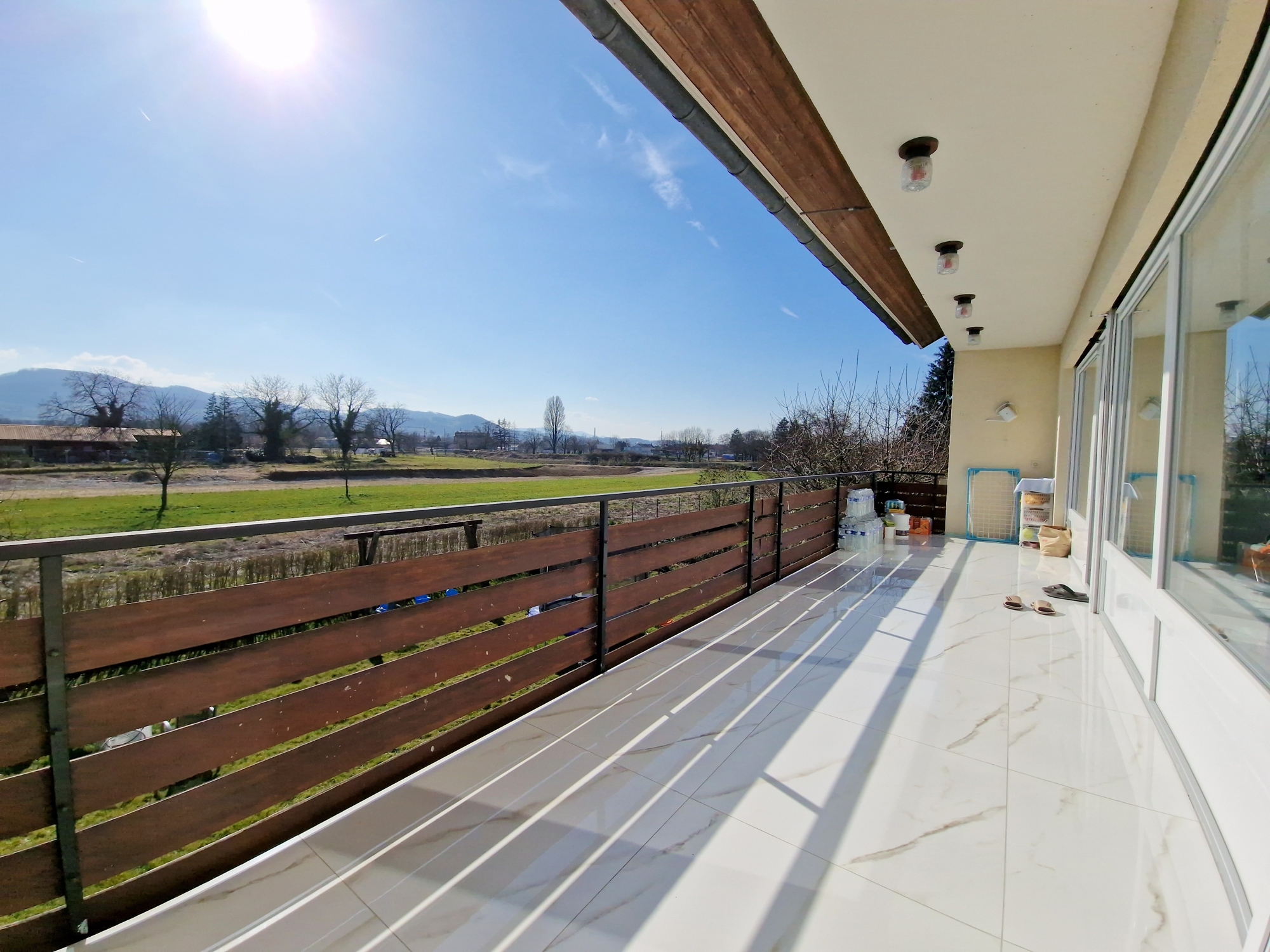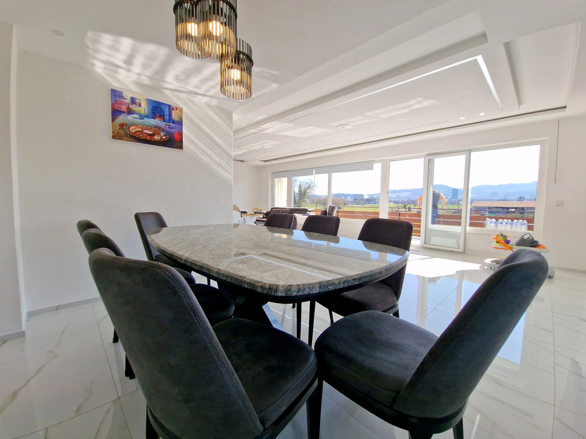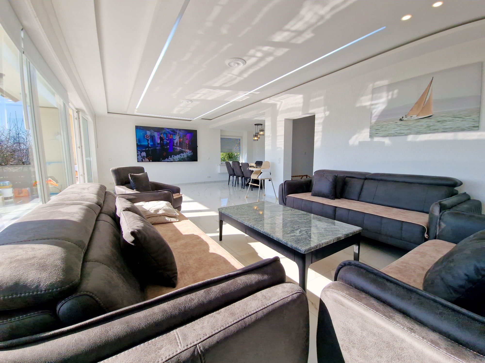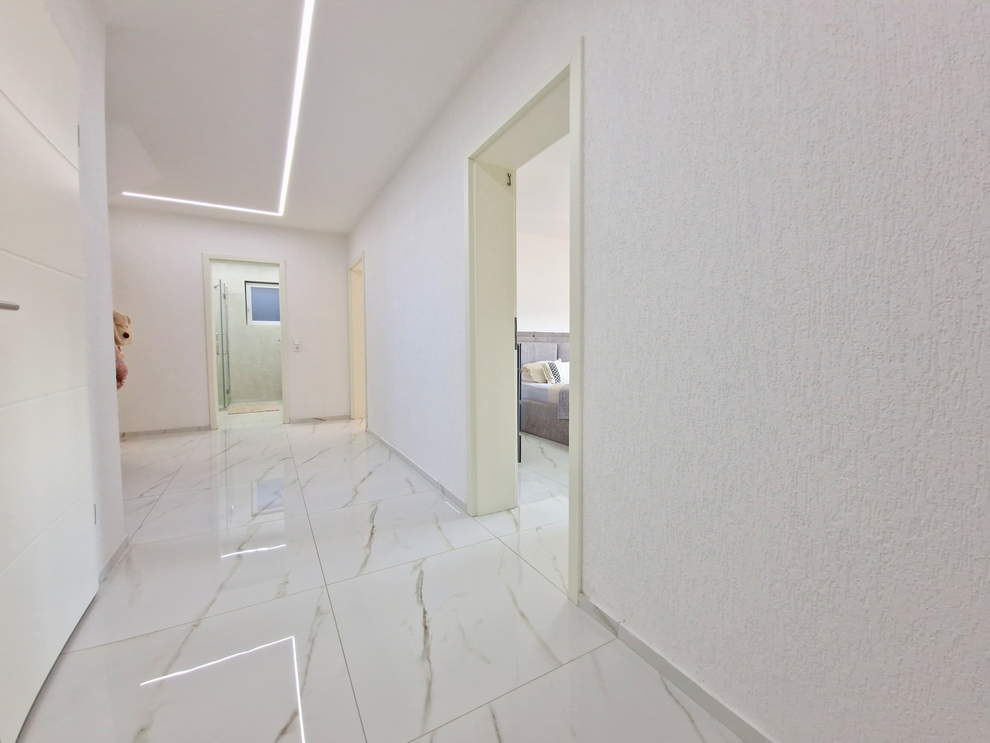 Helle Räume, hochwertige Bodenbeläge und ein offenes Wohnkonzept mit Blick ins Grüne.