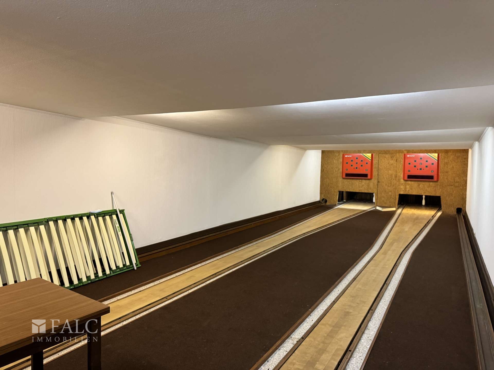 Der großzügige Gastronomiebereich mit ca. 491,34 m² überzeugt durch eine durchdachte Raumaufteilung und vielseitige Nutzungsmöglichkeiten. Über einen einladenden Eingangsbereich gelangen Gäste in den Restaurantbereich mit integrierter Theke, der eine angenehme Atmosphäre für den laufenden Gastronomiebetrieb bietet. Auf derselben Ebene befindet sich zudem ein separates Zimmer, das sich beispielsweise ideal als Kinderspielzimmer, Nebenraum oder privater Gastraum nutzen lässt. Ergänzt wird die Fläche durch einen großen Raum, der sich hervorragend als Gesellschafts-/Tagungsraum anbietet. Für den gastronomischen Betrieb steht eine großzügig eingerichtete und funktionierende Gastronomieküche zur Verfügung. Ein besonderes Highlight stellt die integrierte Kegelbahn mit gemütlichen Sitzmöglichkeiten dar, die zusätzliche Unterhaltungsmöglichkeiten für Gäste bietet. Darüber hinaus befindet sich im Erdgeschoss ein weiterer großer Raum mit separatem Eingang im Objekt, der flexibel genutzt werden kann, beispielsweise als zusätzlicher Gastraum, Veranstaltungsfläche oder Lagerbereich. In diesem Bereich stehen ebenfalls WCs sowie ein praktischer Abstellraum zur Verfügung.