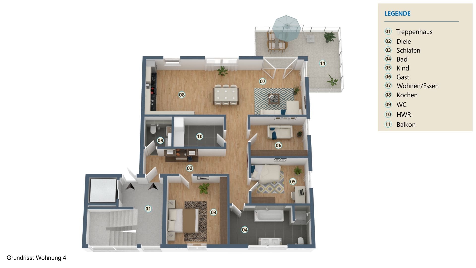 Die Wohnung im Obergeschoss auf der rechten Seite bietet helle, großzügig geschnittene Räume wie z.B. eine offene Küche mit angrenzendem Wohn-/Essbereich, ein Schlafzimmer und zwei zusätzliche Räume. Das Bad ist mit Badewanne und Dusche ausgestattet. Zusätzlich verfügt jede Wohnung über ein Gäste-WC und einen separaten Technik- / Abstellraum.