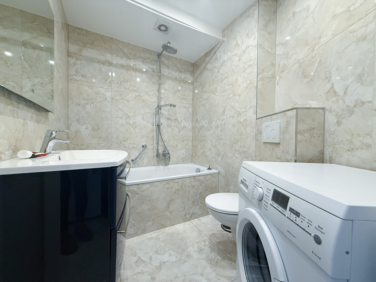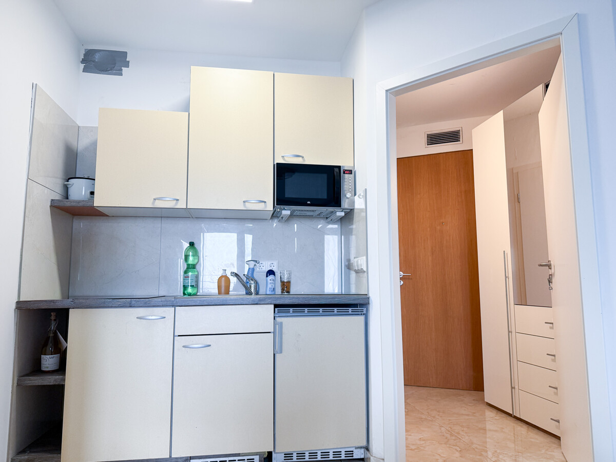 Die integrierte Küchenzeile ist funktional angeordnet und bietet kurze Wege im Alltag. Das Badezimmer ist gefliest und mit einer Badewanne ausgestattet.