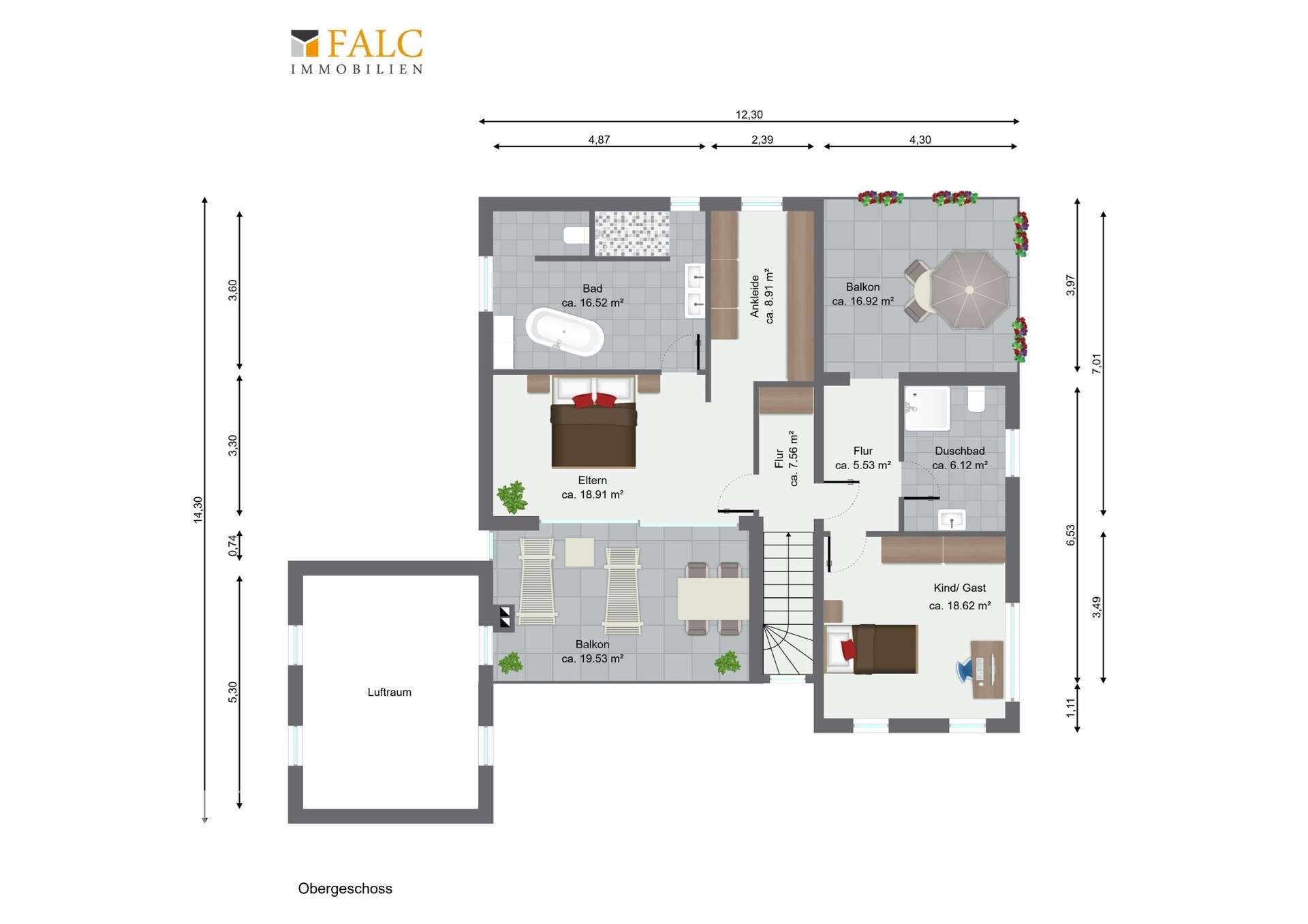 Obergeschoss: + Kinder-/Arbeitszimmer + Schlafzimmer + Hauptbad mit freistehender Badewanne, Dusche, WC + Ankleide + Bad mit Dusche/WC