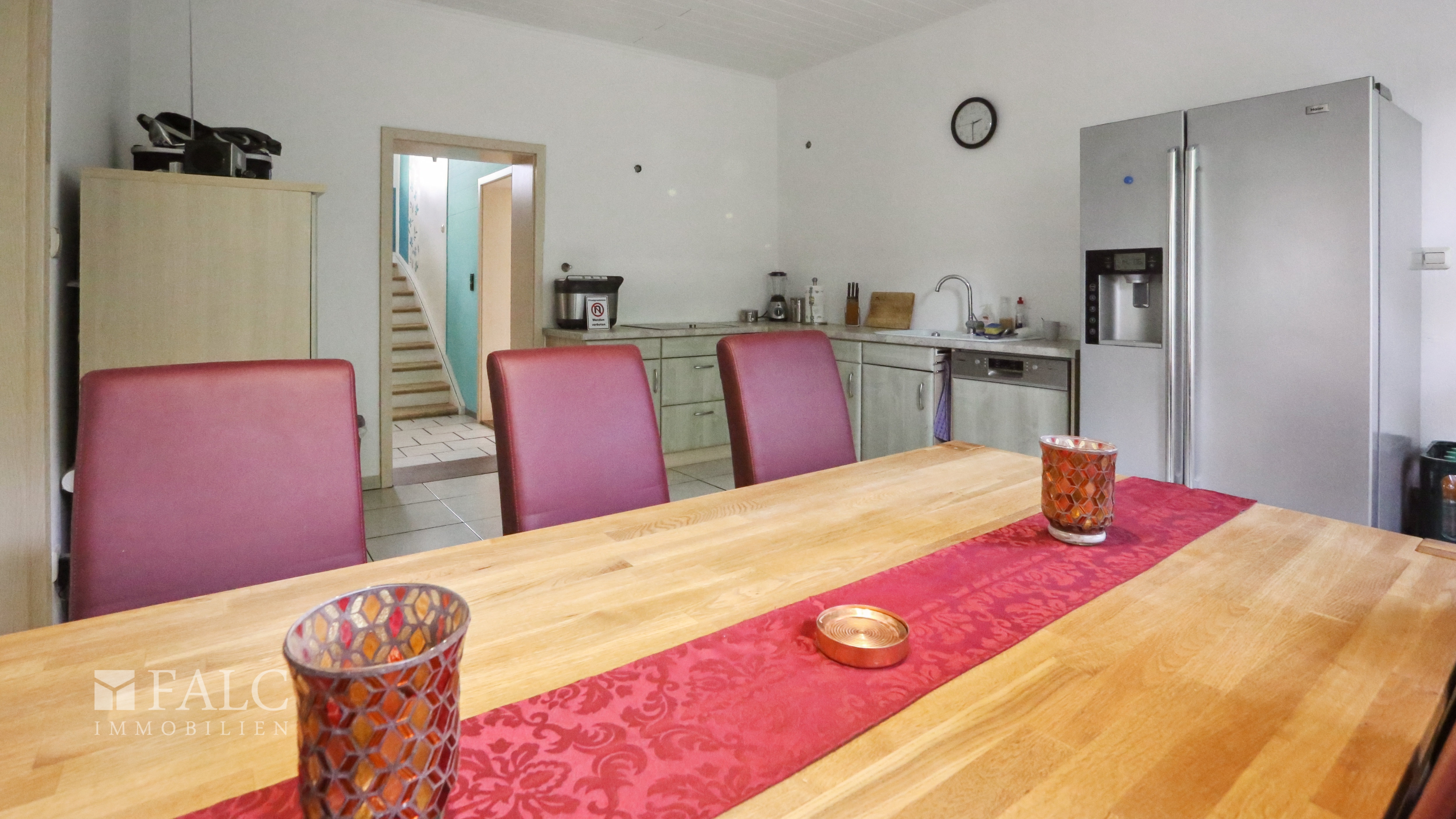 - Wohnung 1: Diese schöne 3-Zimmer-Maisonette-Wohnung hat eine Wohnfläche von ca. 113 m² mit gerade geschnittenen Zimmern. Im Erdgeschoss befindet sich das Schlafzimmer, die Küche, das Wohnzimmer sowie das Bad; im OG das geräumige Büro, das sich aufgrund seiner Holzbalkenkonstruktion auch als Schlaf- und Ankleidezimmer anbietet. Der große Garten zu dieser Wohnung umfasst ca. 1.700 qm.