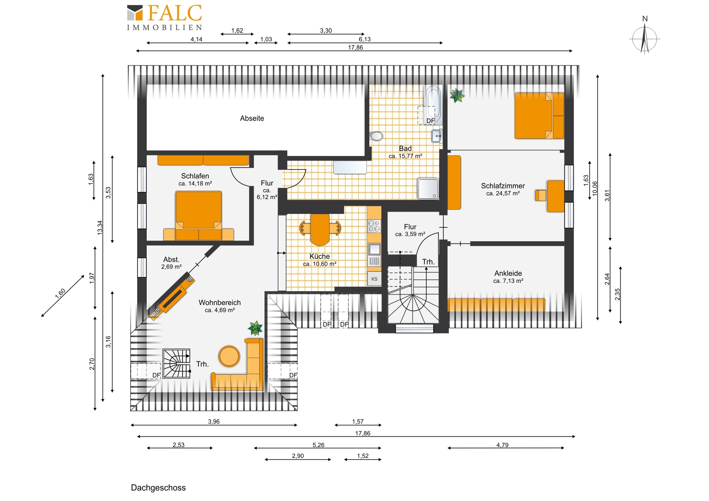 - Wohnung 2: Eine 2-Zimmer-Wohnung mit ca. 60 qm Wohnfläche erreichen Sie über eine noch einzubauende Wendeltreppe. Der Wohnbereich mit Küche, Bad, einem Schlafzimmer und Abstellkammer ist im 1. OG.