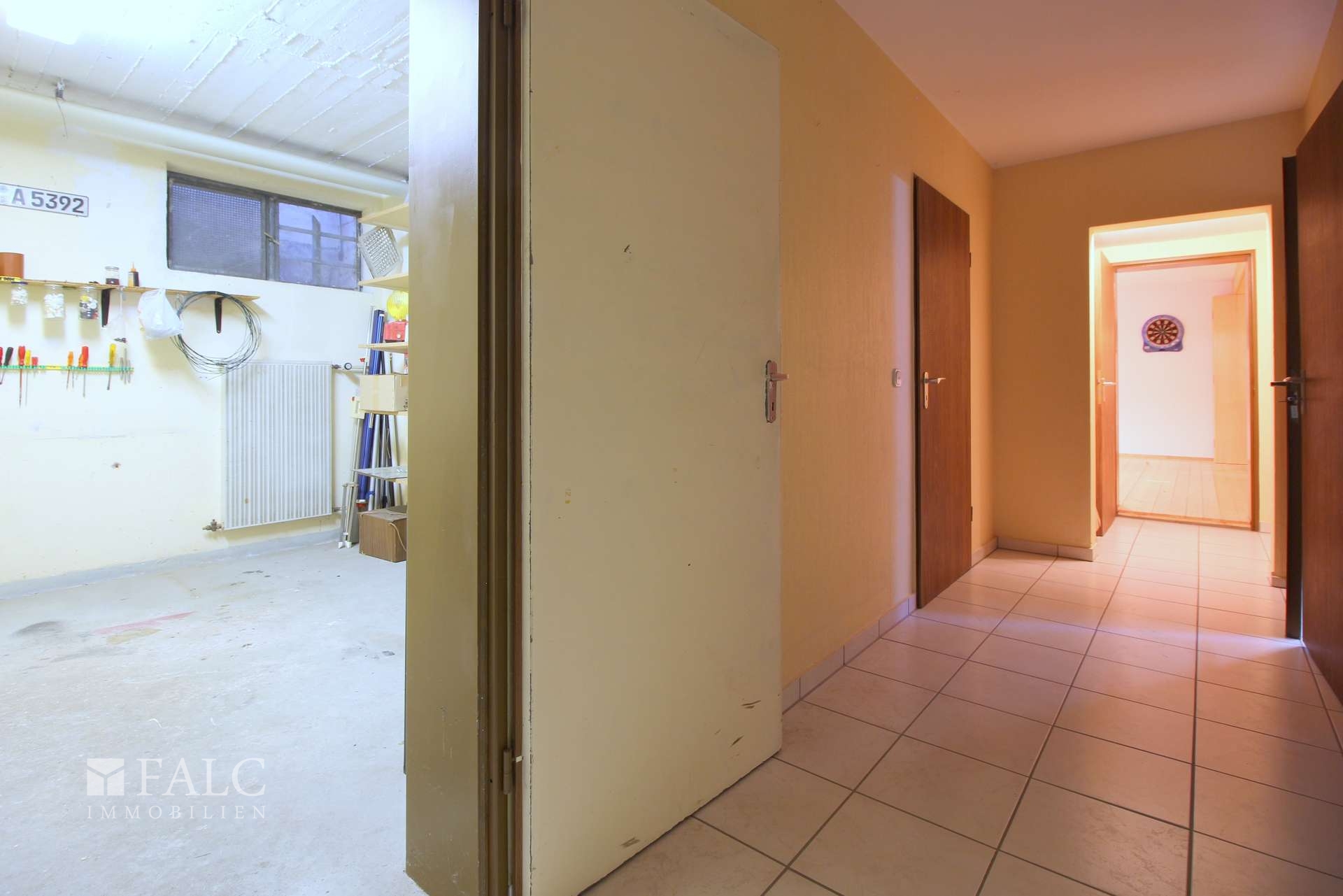 Im Untergeschoss befindet sich die Doppelgarage mit elektrischen Sektionaltoren. Durch eine Tür gelangen Sie trockenen Fußes ins Haus. Herzstück dieser Ebene ist sicherlich der große Hobby- und Gemeinschaftsraum mit Zugang zu Terrasse und Garten sowie einem angrenzendem Gäste-WC. Hier befand sich früher ein Schwimmbad, das auch revitalisiert werden könnte. Ein weiteres Zimmer sowie ein drittes Badezimmer mit Dusche erweitern den Wohnraum. Nebenräume auf dieser Etage sind der Heizungsraum, eine Werkstatt, der Wasch- und Trockenraum sowie weitere Keller- und Abstellräume.