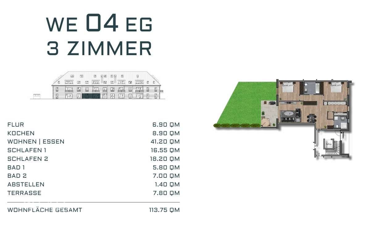 3 Zimmer, 113 m² Wohnfläche – Barrierefrei Garten und Terrasse 2 Bäder (Ebenerdige Dusche und Badewanne) Fußbodenheizung mit Einzelraumregelung Bodenbelag: Parkett, Feinsteinzeugfliesen in den Bädern (Farbe nach Wahl) Elektrische Rollläden Fahrstuhl – von der Tiefgarage bis zur Wohnung barrierefrei Tiefgaragenstellplatz mit Handsensor (25.000 € pro Stellplatz) Kellerraum Gehobene Massivbauweise und aufwendige Fassadengestaltung Videogegensprechanlage Wasch- und Trockenraum Fahrradstellplätze Kabel und Sat Fenster: Dreifachverglast, Sicherheitskonzept durch Pilzzapfenverriegelung, RC2 Beschläge Luftwärmepumpe mit Photovoltaik Anlage KfW 55 Standard (Die genaue Ausstattung entnehmen Sie bitte der Bau- und Ausstattungsbeschreibung)