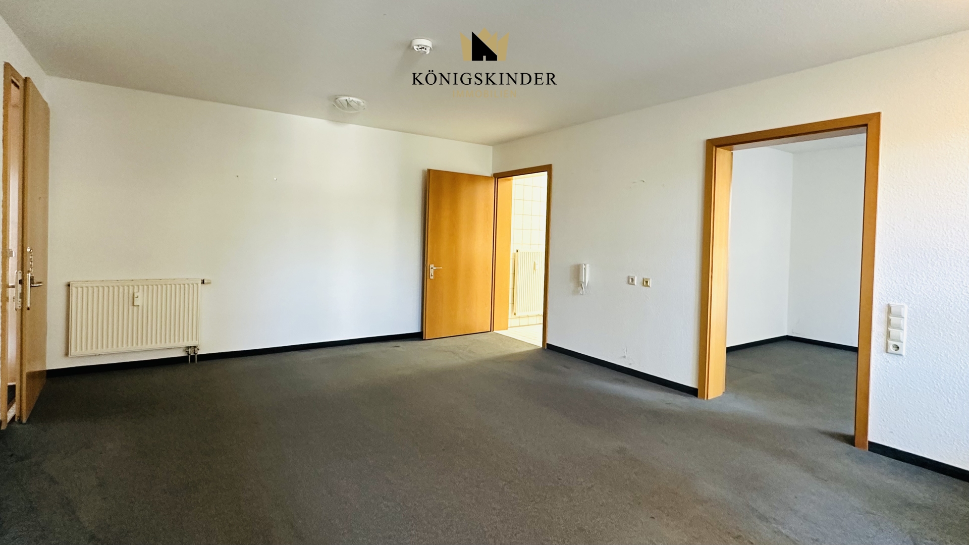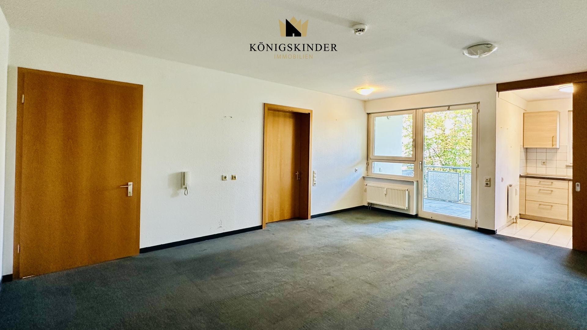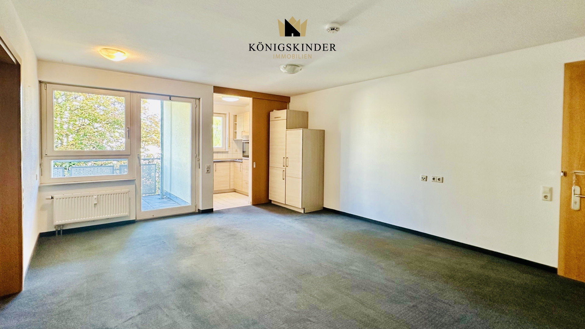Das Wohnzimmer mit Teppichboden bietet eine angenehme Atmosphäre und direkten Zugang zum Balkon, der zum Verweilen an der frischen Luft einlädt. Eine kleine Einbauküche ermöglicht eine einfache Selbstversorgung. Das Schlafzimmer ist gut geschnitten und bietet ausreichend Platz für eine seniorengerechte Möblierung.