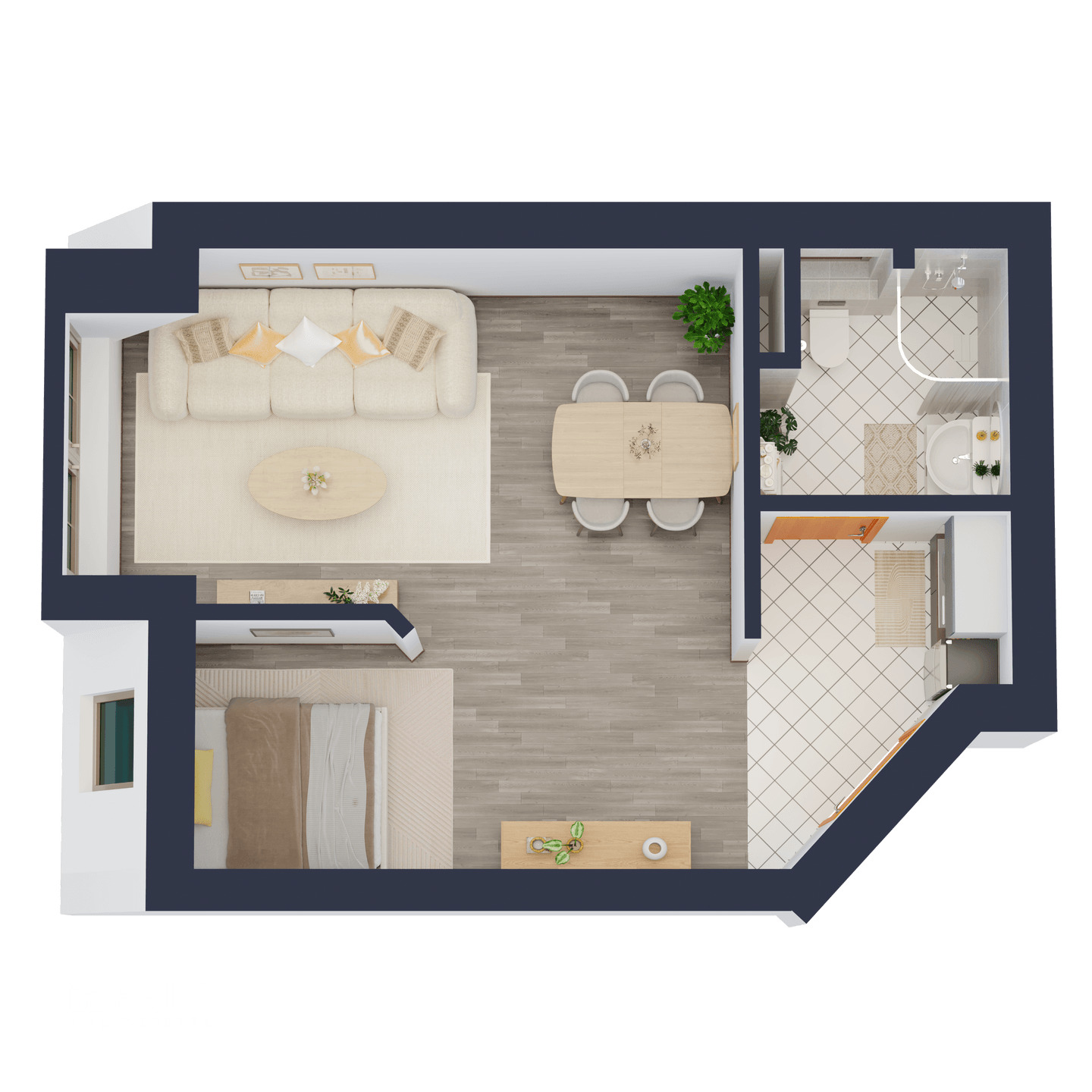 Auf der Ebene der Wohnung sind ein Wohnbereich mit integriertem Schlafbereich, eine separate Küche sowie ein Badezimmer angeordnet. Der Eingangsbereich führt direkt in die Wohnung und verbindet die einzelnen Bereiche auf kurzen Wegen.