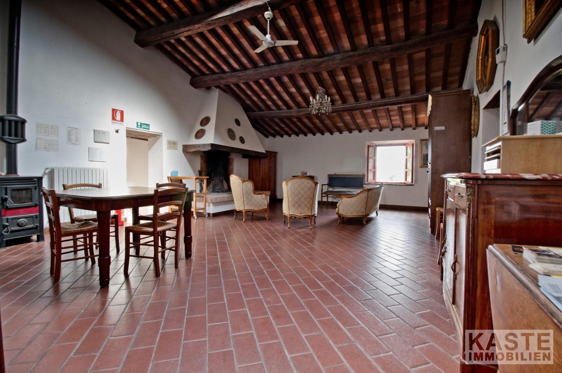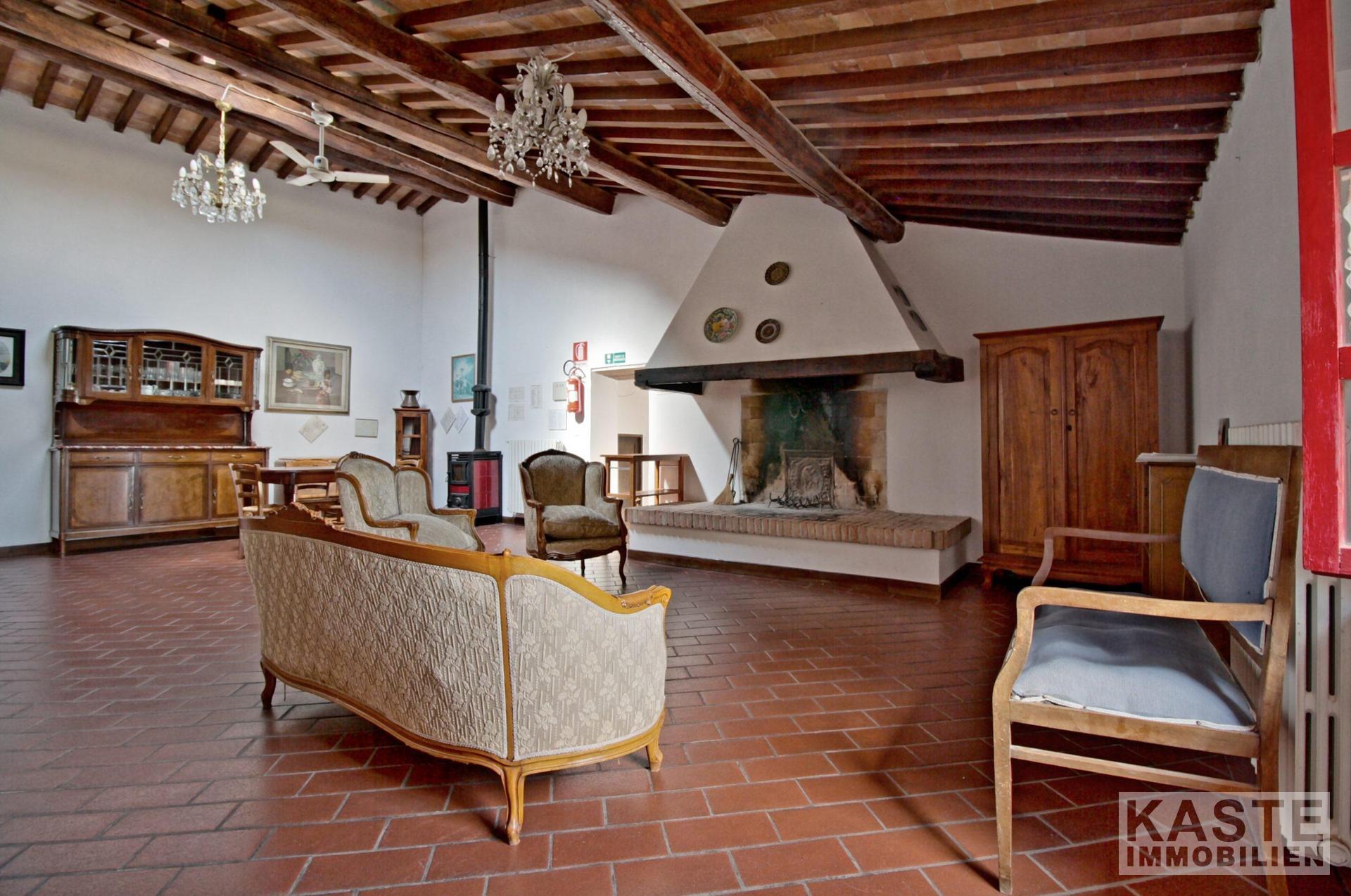 Im ersten Stock erwartet Sie ein großer Gemeinschaftsraum mit Kamin, Sofas und Sesseln – der perfekte Ort, um sich in geselliger Runde zu entspannen. Die umliegenden Grünflächen und atemberaubenden Aussichten laden zum Verweilen ein. Der Bauernhof und der Agriturismo sind bio-zertifiziert, was nachhaltigen Tourismus garantiert.