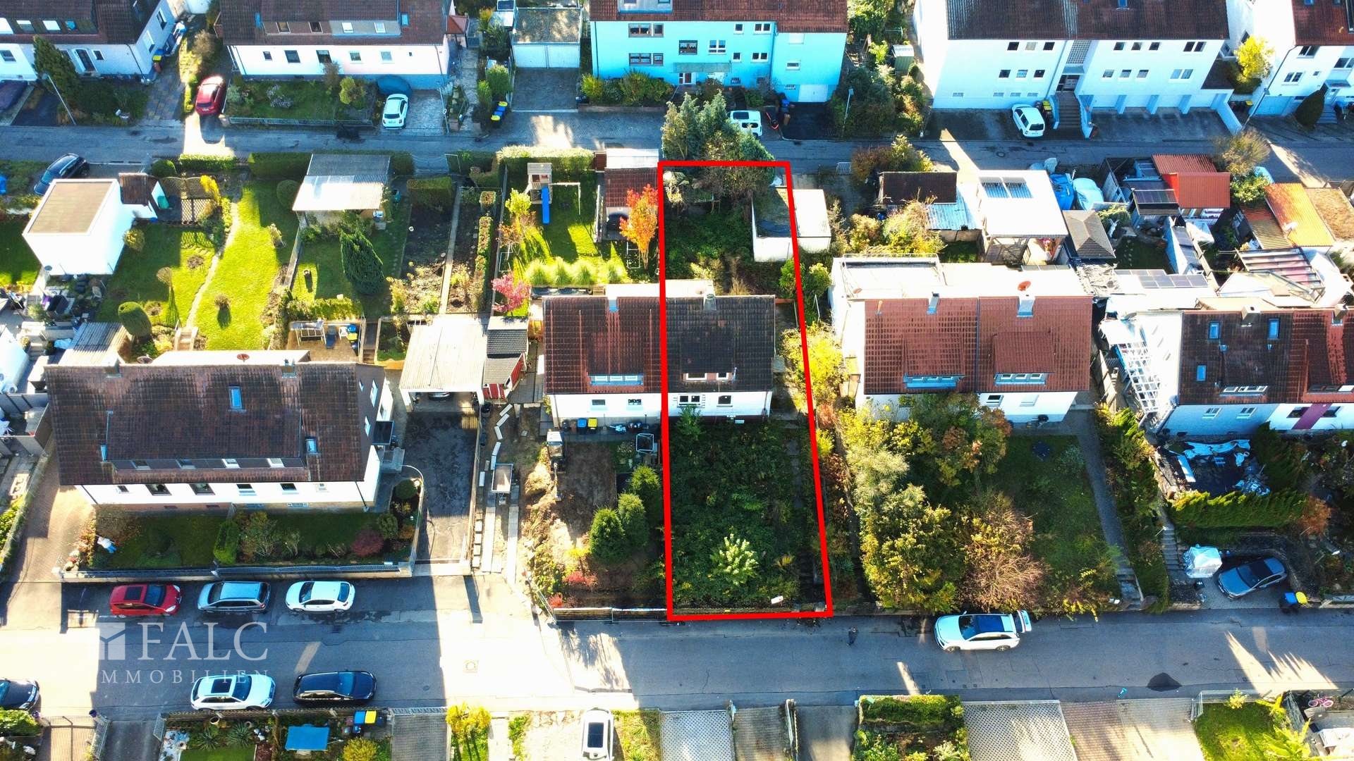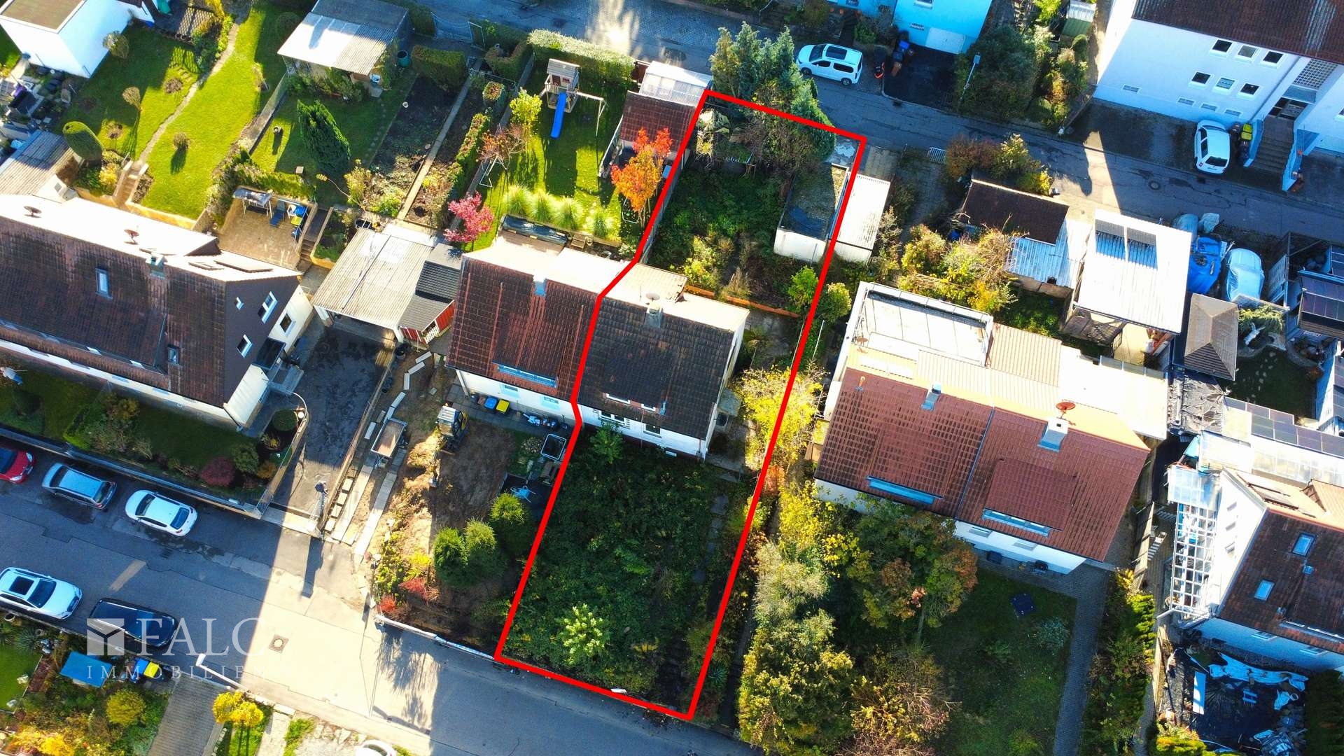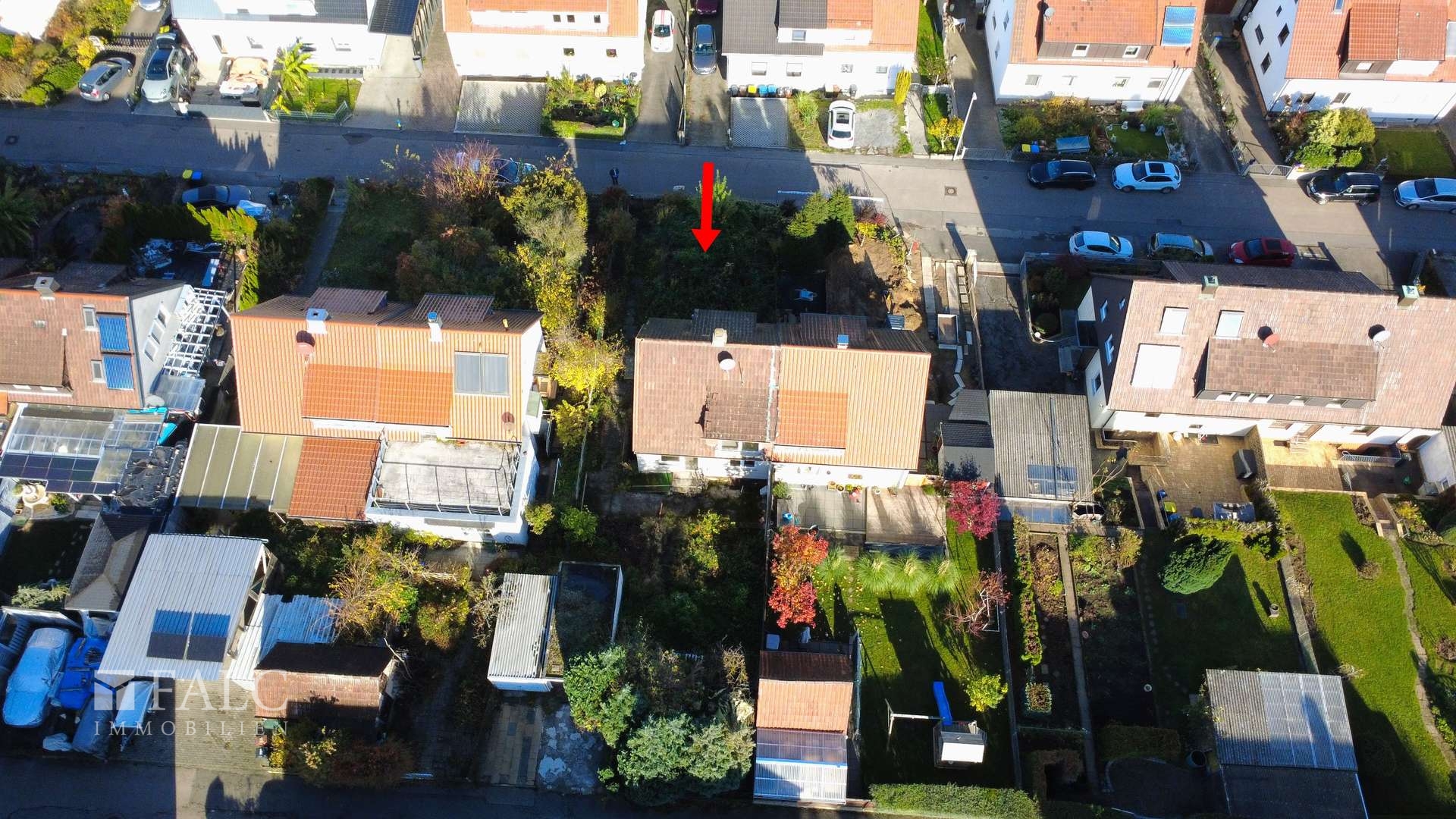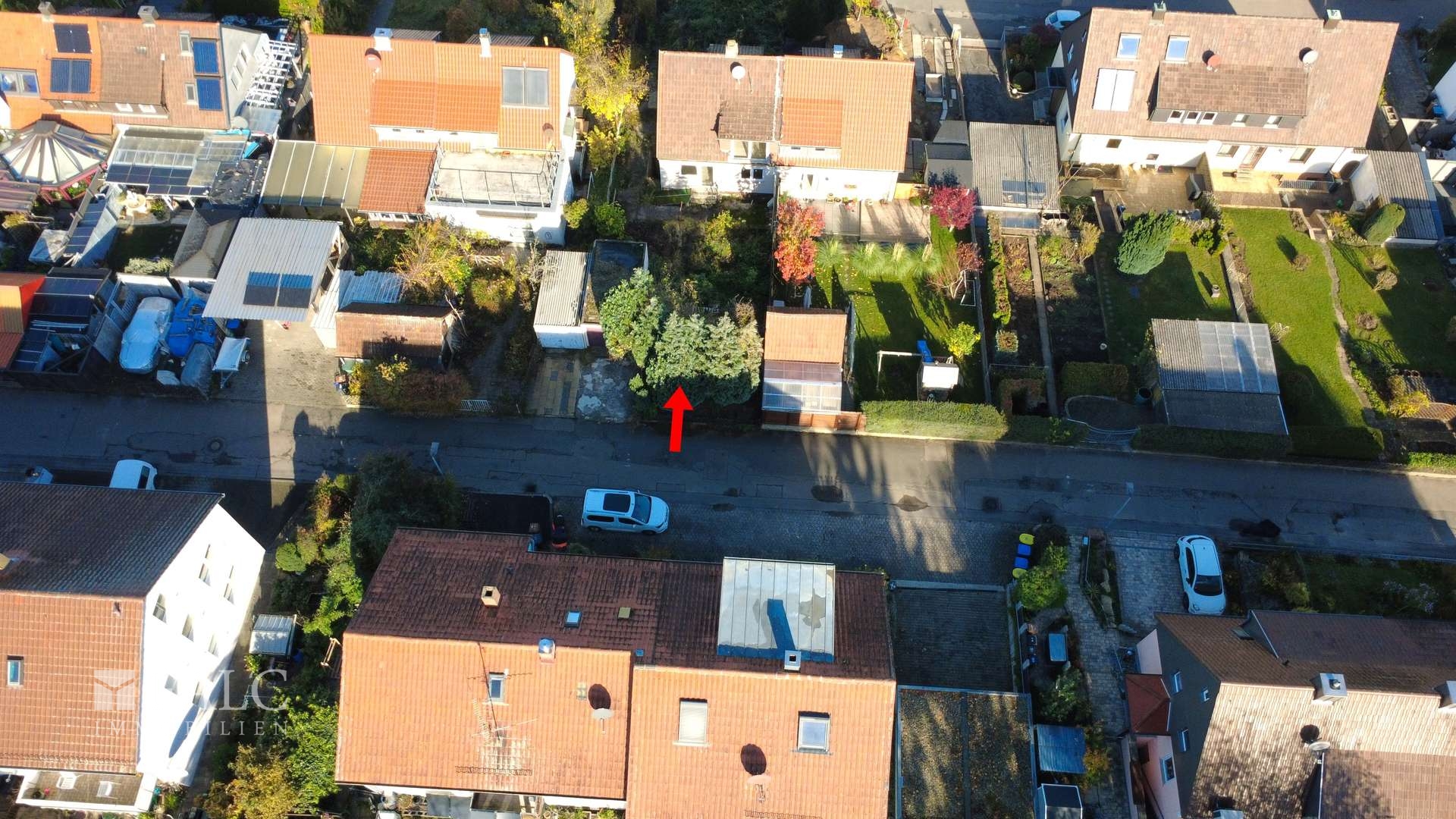 Bereits vorhanden ist eine genehmigte Bauplanung inklusive gültigem Baufreigabeschein (roter Punkt). Sie können also ohne Verzögerung mit dem Neubau beginnen. Aktuell befindet sich auf dem Grundstück eine stark sanierungsbedürftige Doppelhaushälfte mit alter Garage, die sich bestens für den Abriss eignet, um Platz für Ihren Neubau zu schaffen.