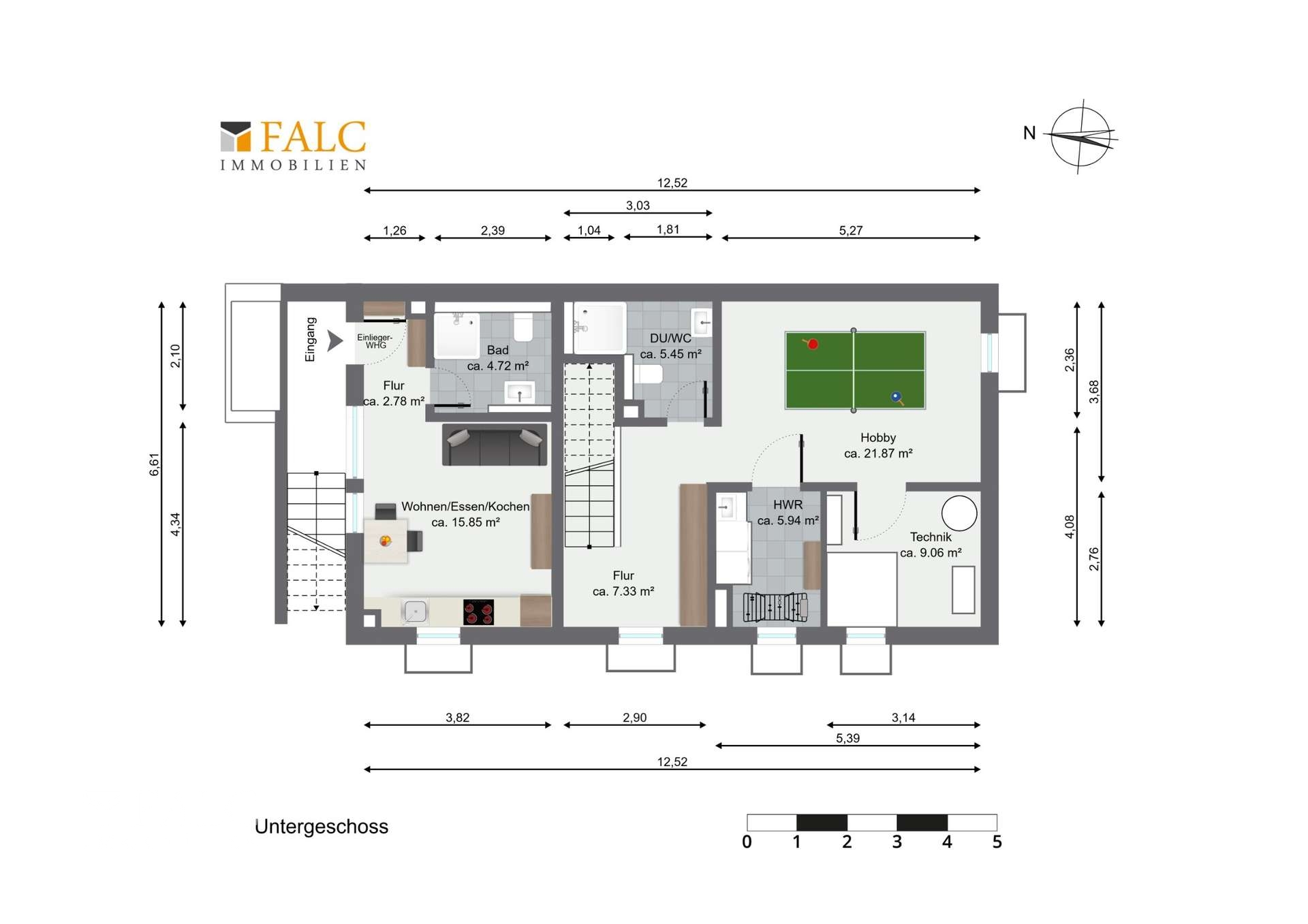 UG im Haupthaus: - Hobby-/Partyraum. - Badezimmer m/ WC. - Hauswirtschaftsraum. - Technikraum.