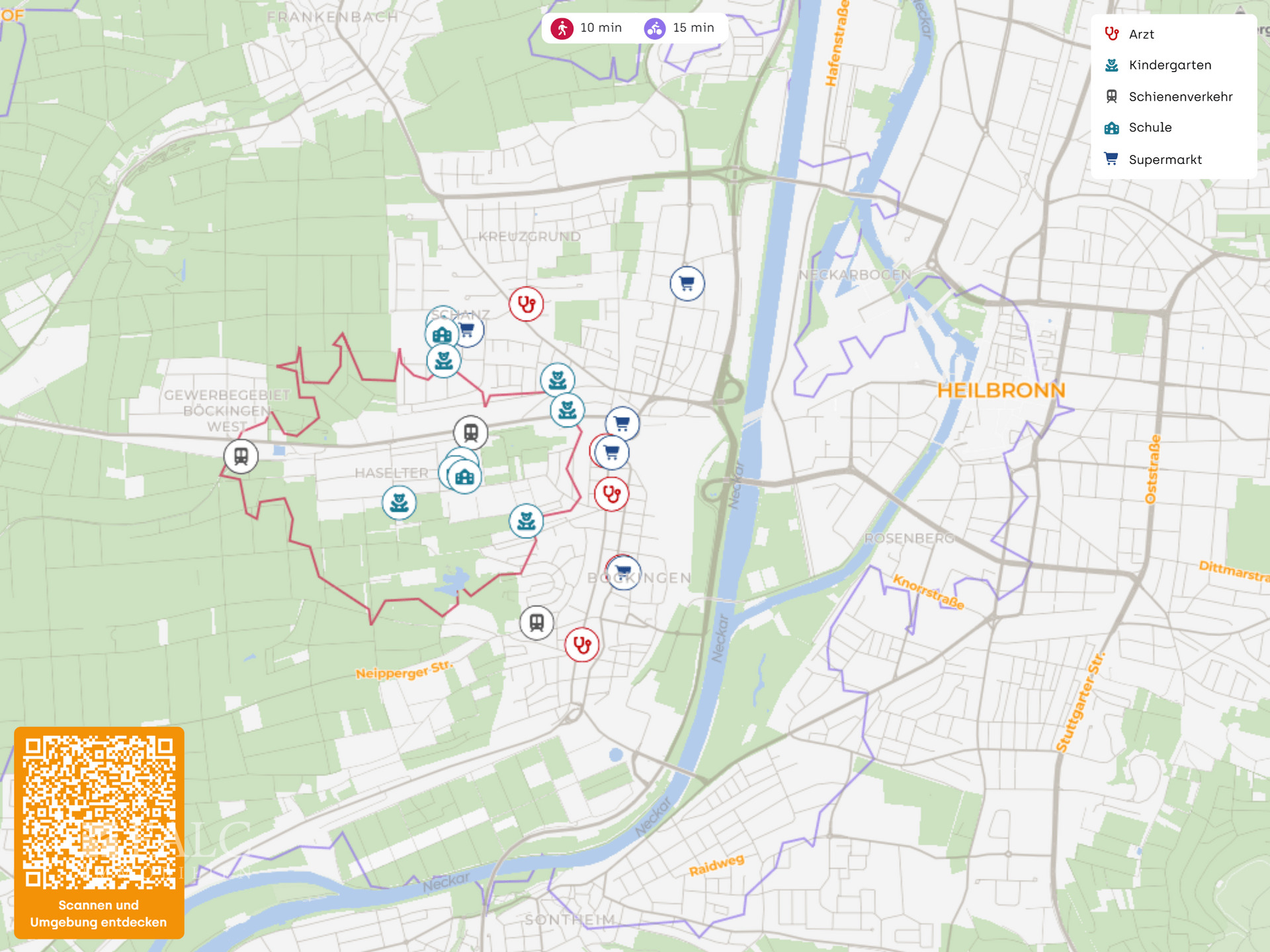 In nur wenigen Minuten sind Einkaufsmöglichkeiten, wie zum Beispiel ein Lidl zu erreichen. Ebenso befinden sich das Bürgeramt, Banken, Friseure, Bäcker, Apotheken, Restaurants und vieles mehr in der näheren Umgebung. Eine ausgezeichnete Anbindung, dank Stadtbus und Straßenbahn in die Heilbronner City, sind gegeben.