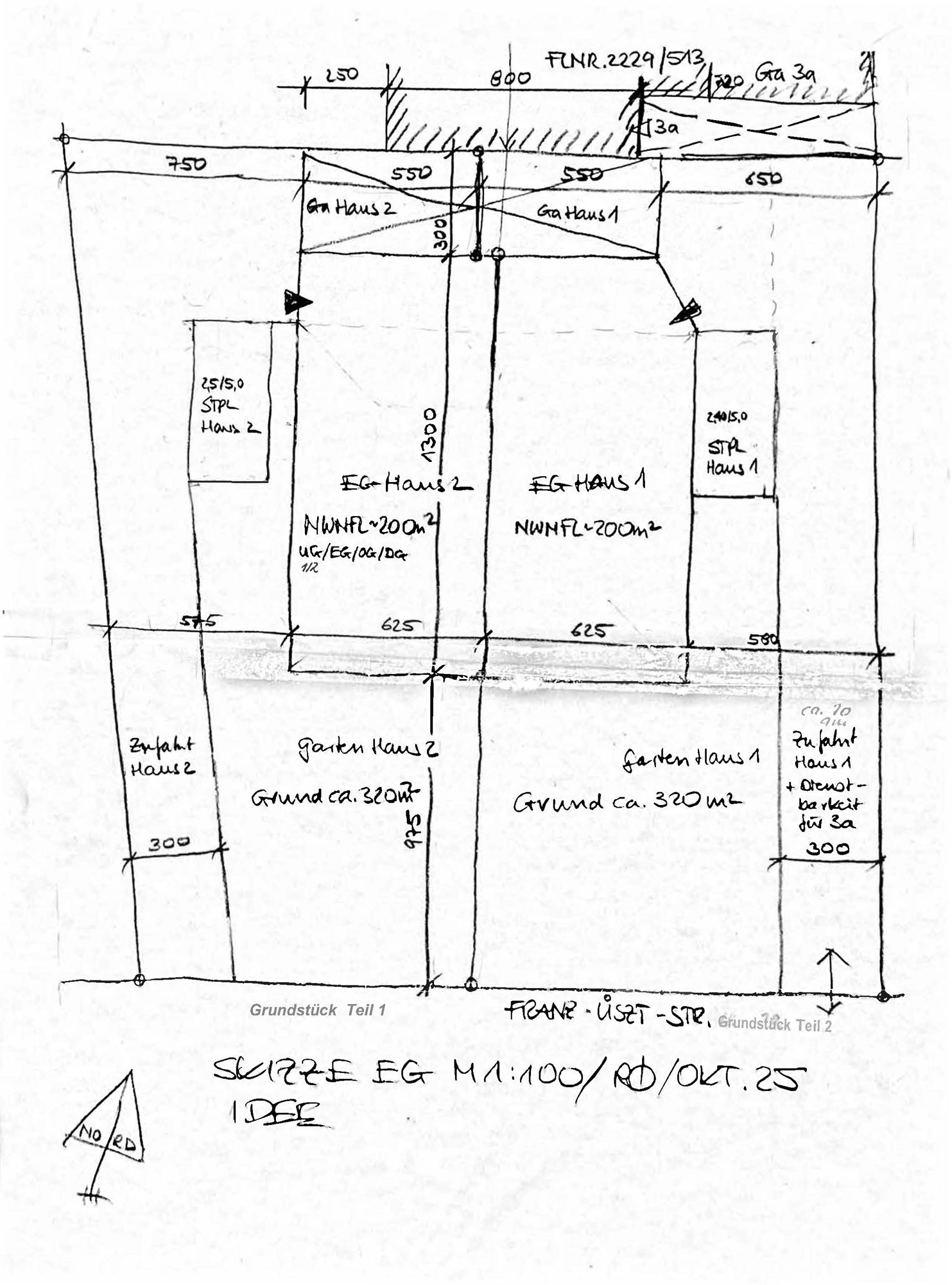 - halbes Grundstück mit Süd-Ausrichtung - voll erschlossen - Vorbescheid mit kleinen Abweichungen genehmigt - DHH mit ca. 200 qm Wohn-Nutzfläche möglich - Verfügbarkeit nach Absprache / ca. April 2026 - Dienstbarkeit auf dem Grundstück für Zufahrt hinteres Haus