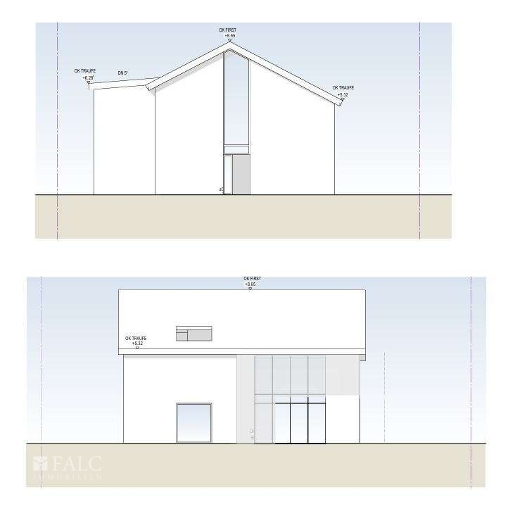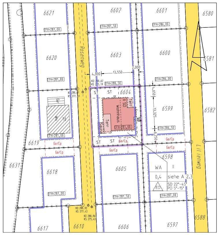 Aktuell liegt bereits eine genehmigte Bauvariante vor: Neubau eines Einfamilienhauses mit Einliegerwohnung, inklusive vier PKW-Stellplätzen sowie zwei Terrassen.