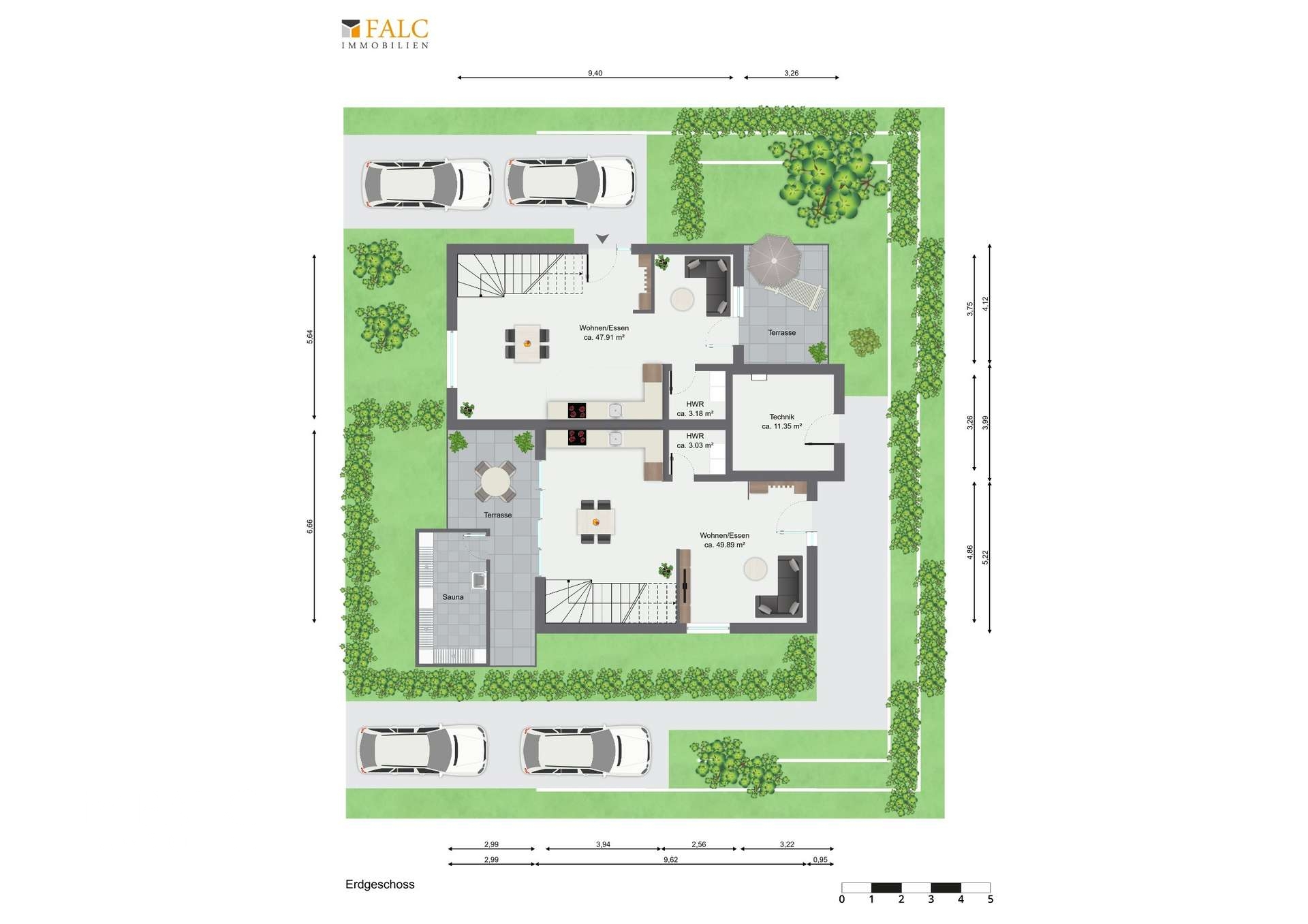 Ein großzügiges Einfamilienhaus mit 2 Geschossen inkl. einer Einliegerwohnung und sep. Eingängen, 2 Terrassen, 4 PKW-Stellplätzen und einer Sauna im Haupthaus mit zusätzlichen Gartenflächen sowie einem gemeinsamen Technikraum.