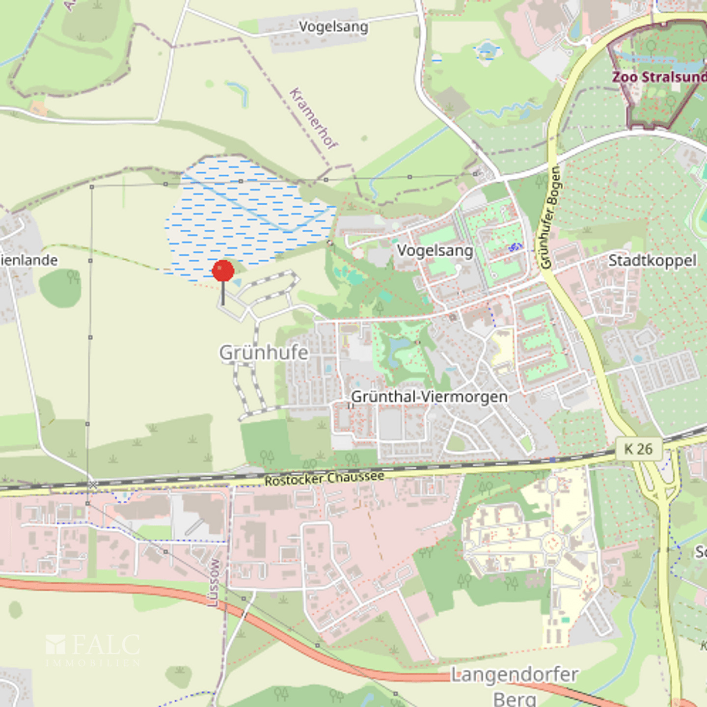 Zum Verkauf steht ein unbebautes, voll erschlossenes und bauträgerfreies Baugrundstück mit einer Gesamtgröße von ca. 574 m² im westlichen Stadtgebiet der Hansestadt Stralsund. Das Grundstück liegt ruhig an einer leichten Kurve einer verkehrsberuhigten Spielstraße mit eigener Zufahrt. Die Ausrichtung des Grundstücks ist besonders attraktiv – die Längsseite einer möglichen Bebauung zeigt nach Süden und ermöglicht damit eine optimale Belichtung. Von der Grundstücksgrenze bietet sich ein freier Blick ins Grüne; lediglich eine Häuserzeile trennt das Grundstück von den angrenzenden Freiflächen. Die Umgebung ist geprägt von aufgelockerter Wohnbebauung und viel Grün.