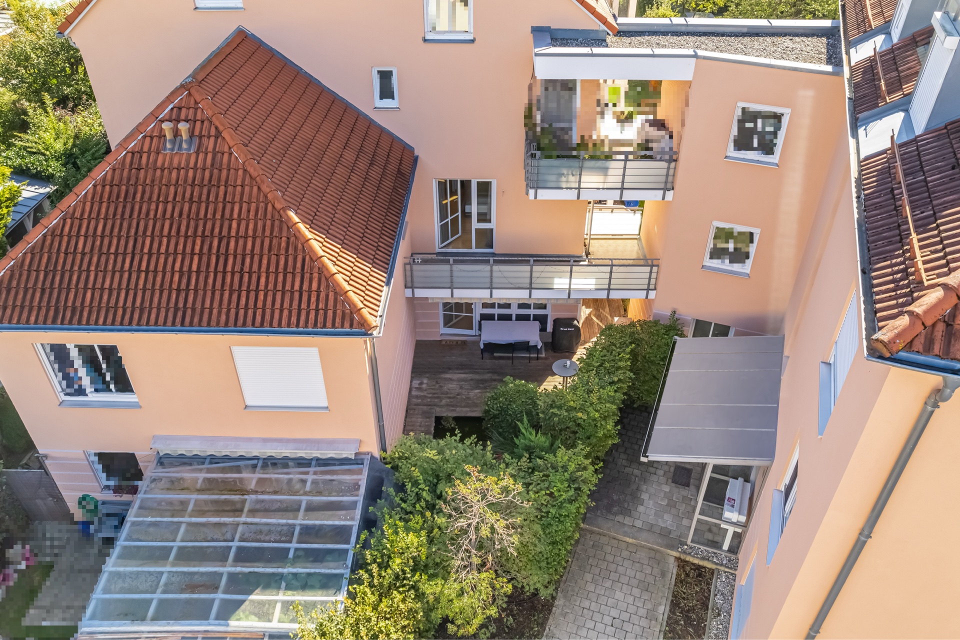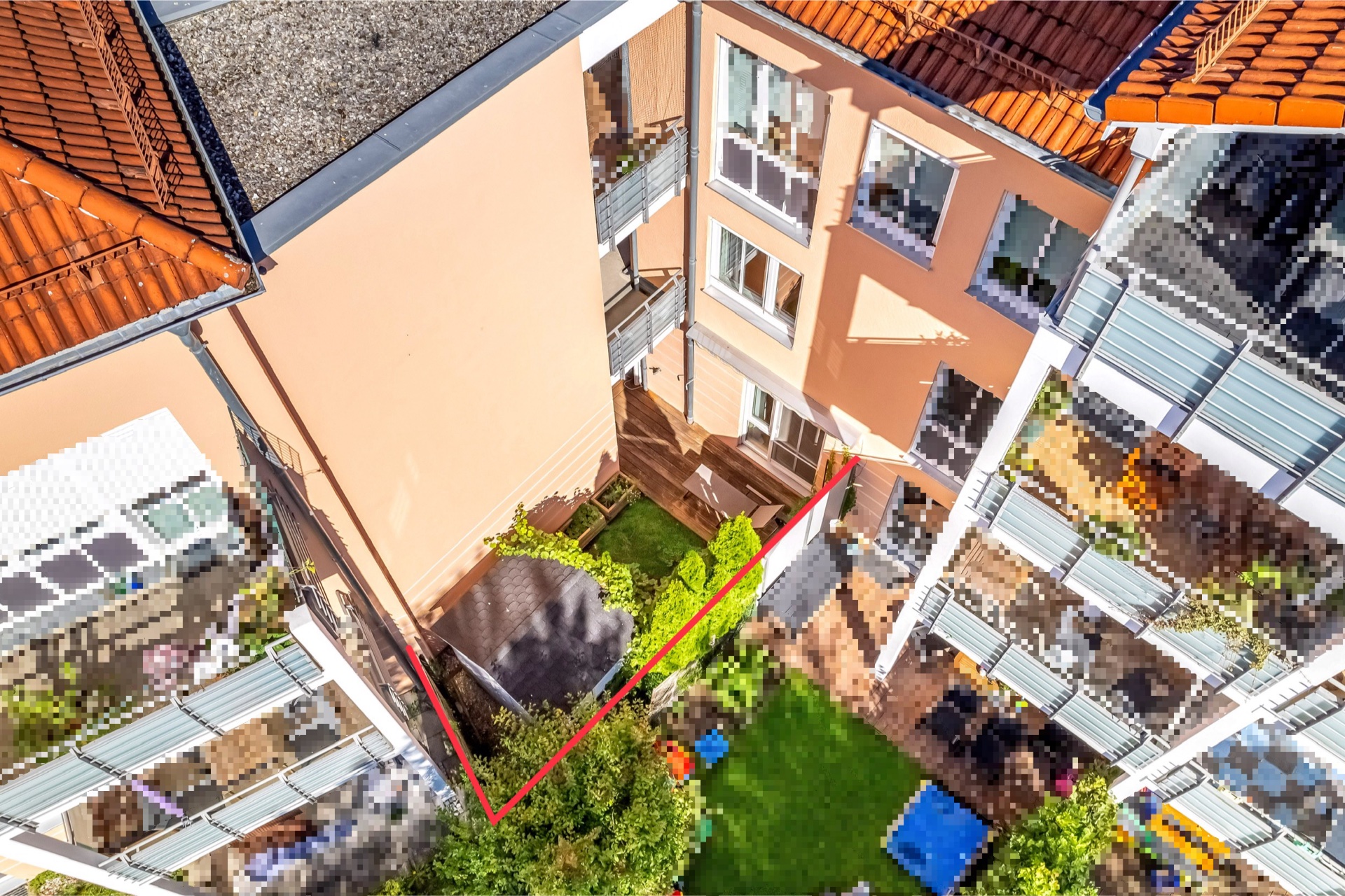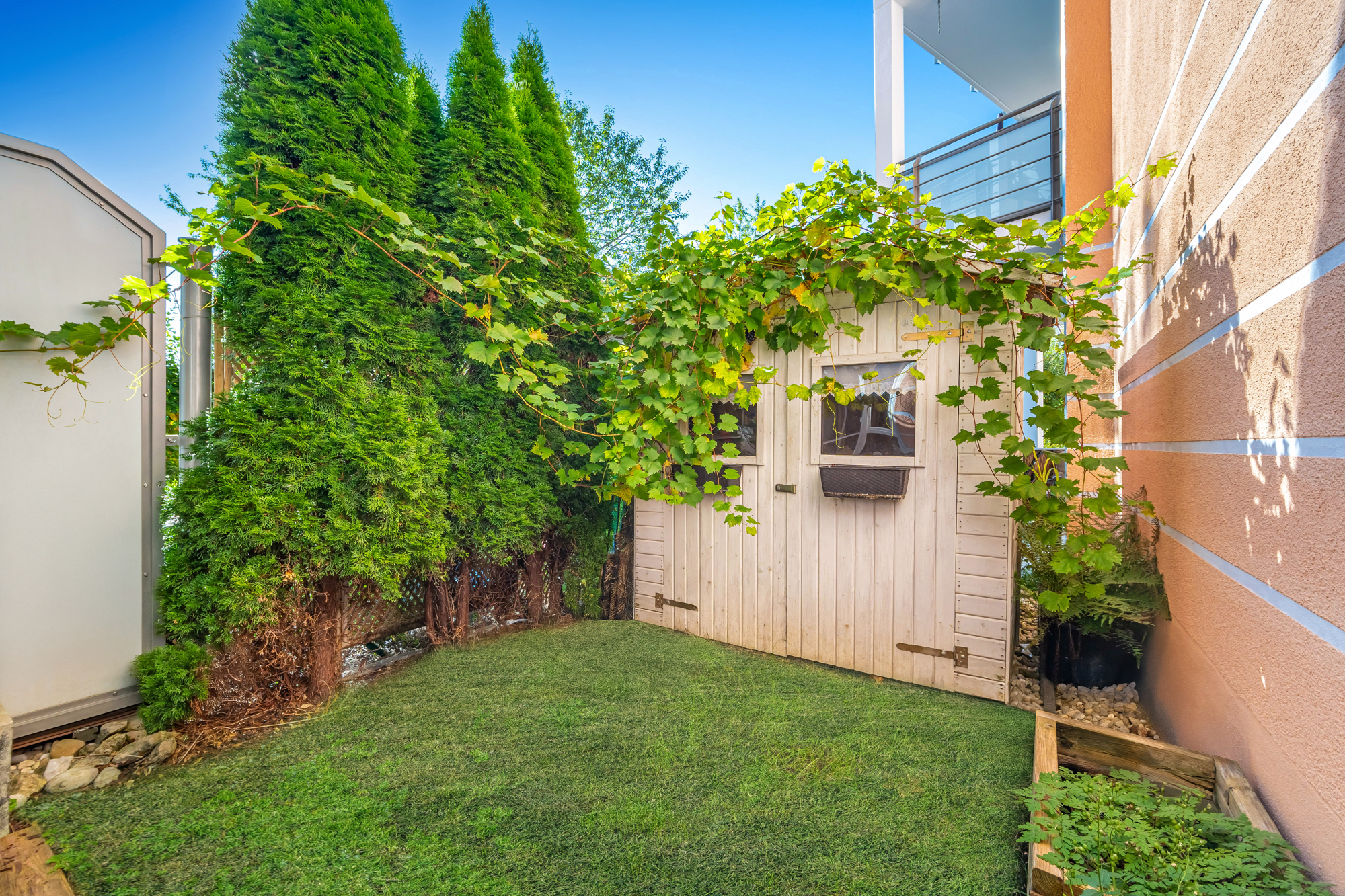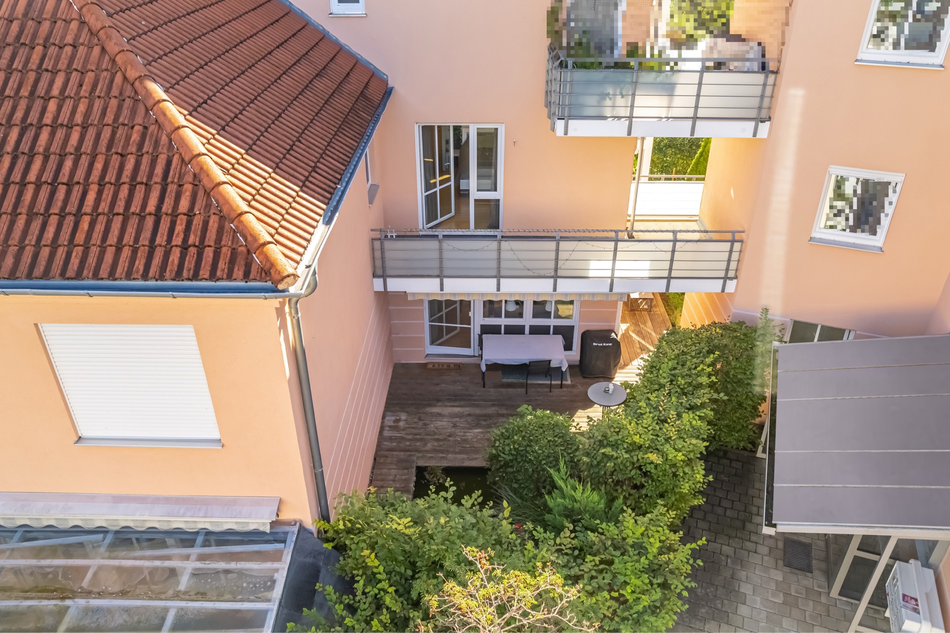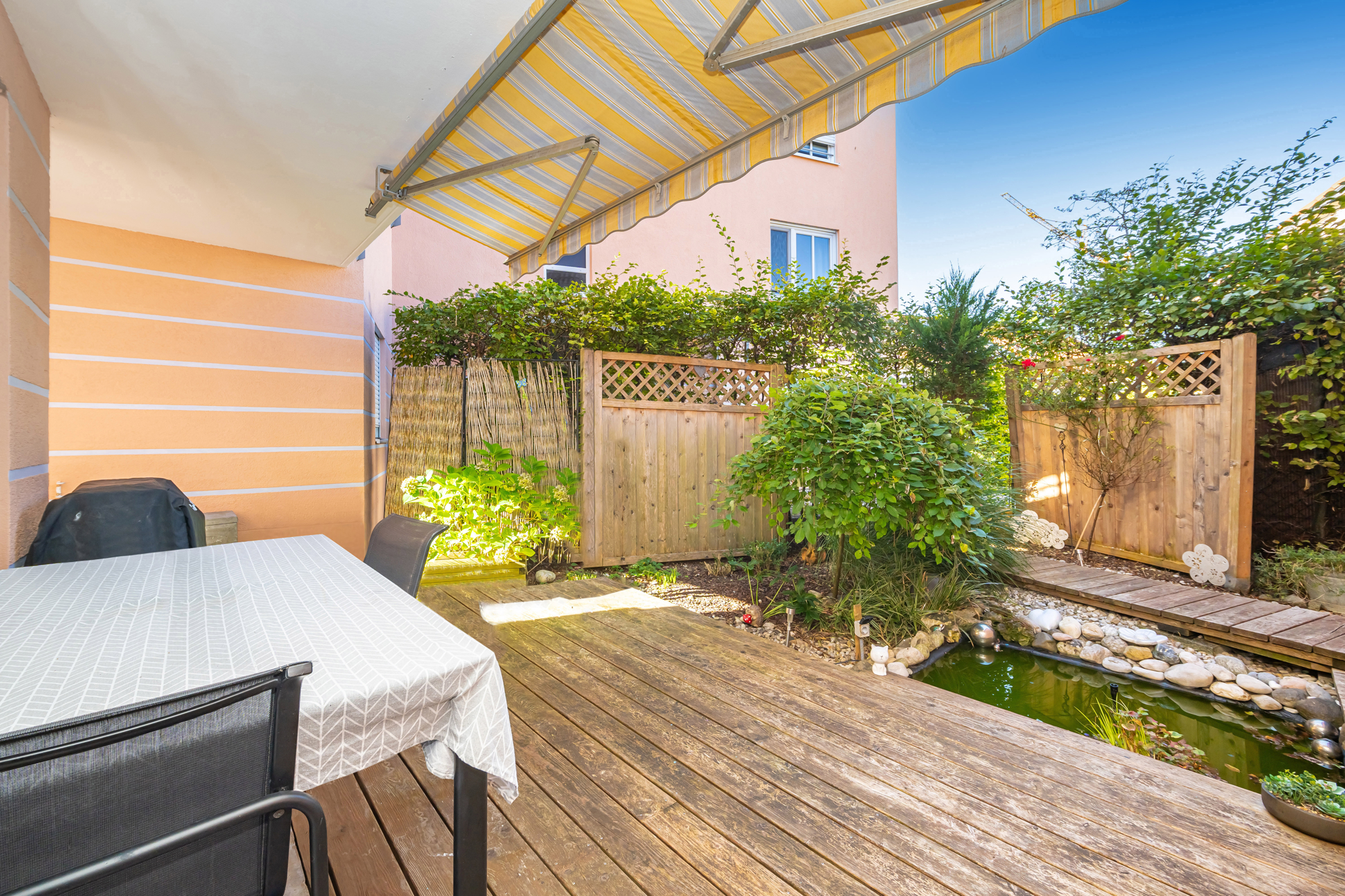 Die Pluspunkte auf einen Blick: • 3 Zimmer + Hobbykeller (UG) • Großzügiger, lichtdurchfluteter Wohn- und Essbereich mit direktem Zugang zu beiden Terrassen • Terrasse in West-Ausrichtung mit angrenzender, kleiner Teichanlage • Weitere Terrasse in Süd-Ausrichtung mit kleinem Gartenanteil • Praktisches Gartenhaus für Gartengeräte und Zubehör • Großzügiger Balkon mit West-Ausrichtung • Gäste-WC im Erdgeschoss • Badezimmer mit Badewanne und Waschmaschinenanschluss im Obergeschoss • elektrische Rollläden mit eingebauter Zeitschaltuhr an nahezu allen Fenstern • Nützliche Abstellkammer (UG) • Gemeinschaftlicher Fahrrad-Keller • 1 Tiefgaragen-Einzelstellplatz