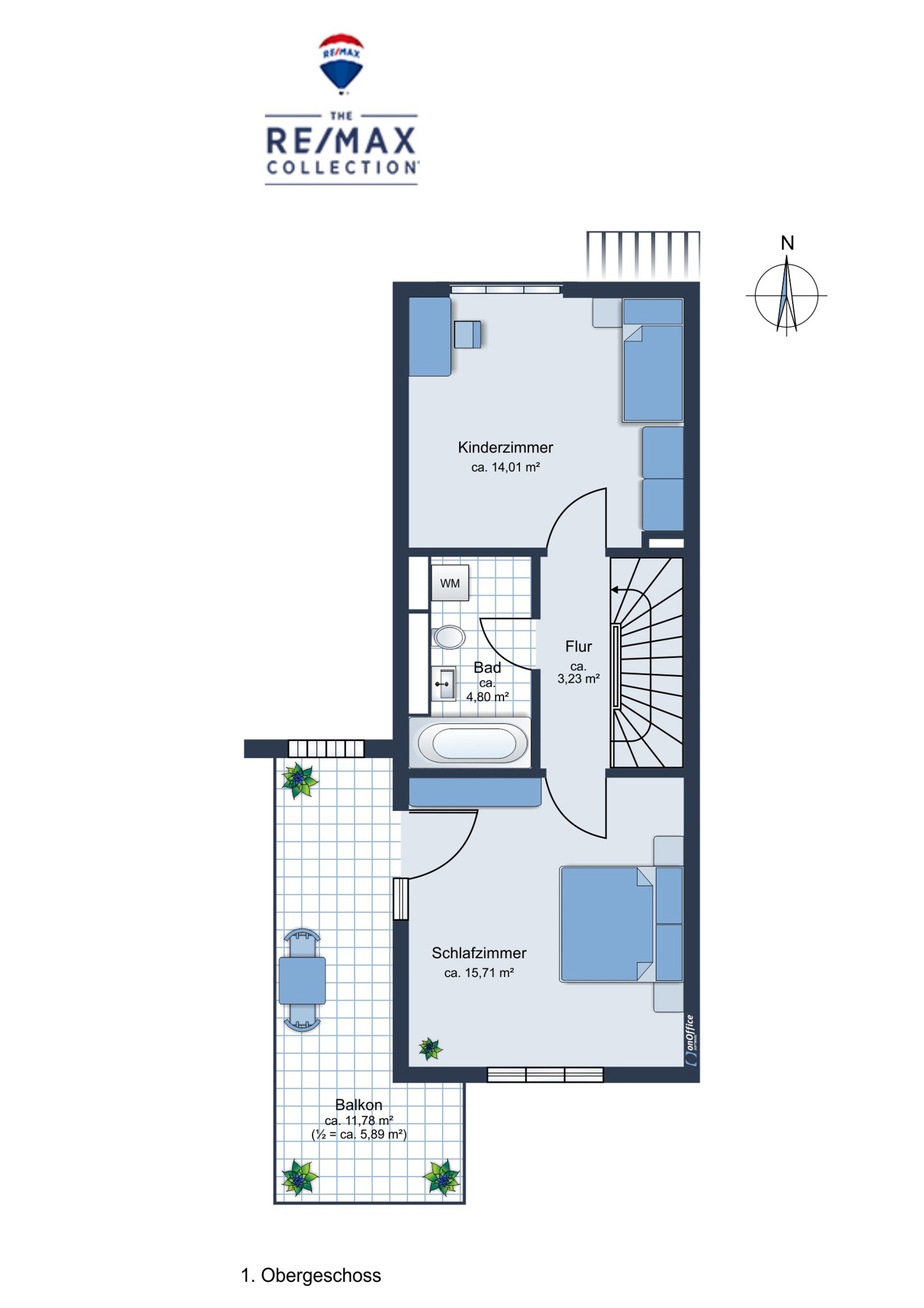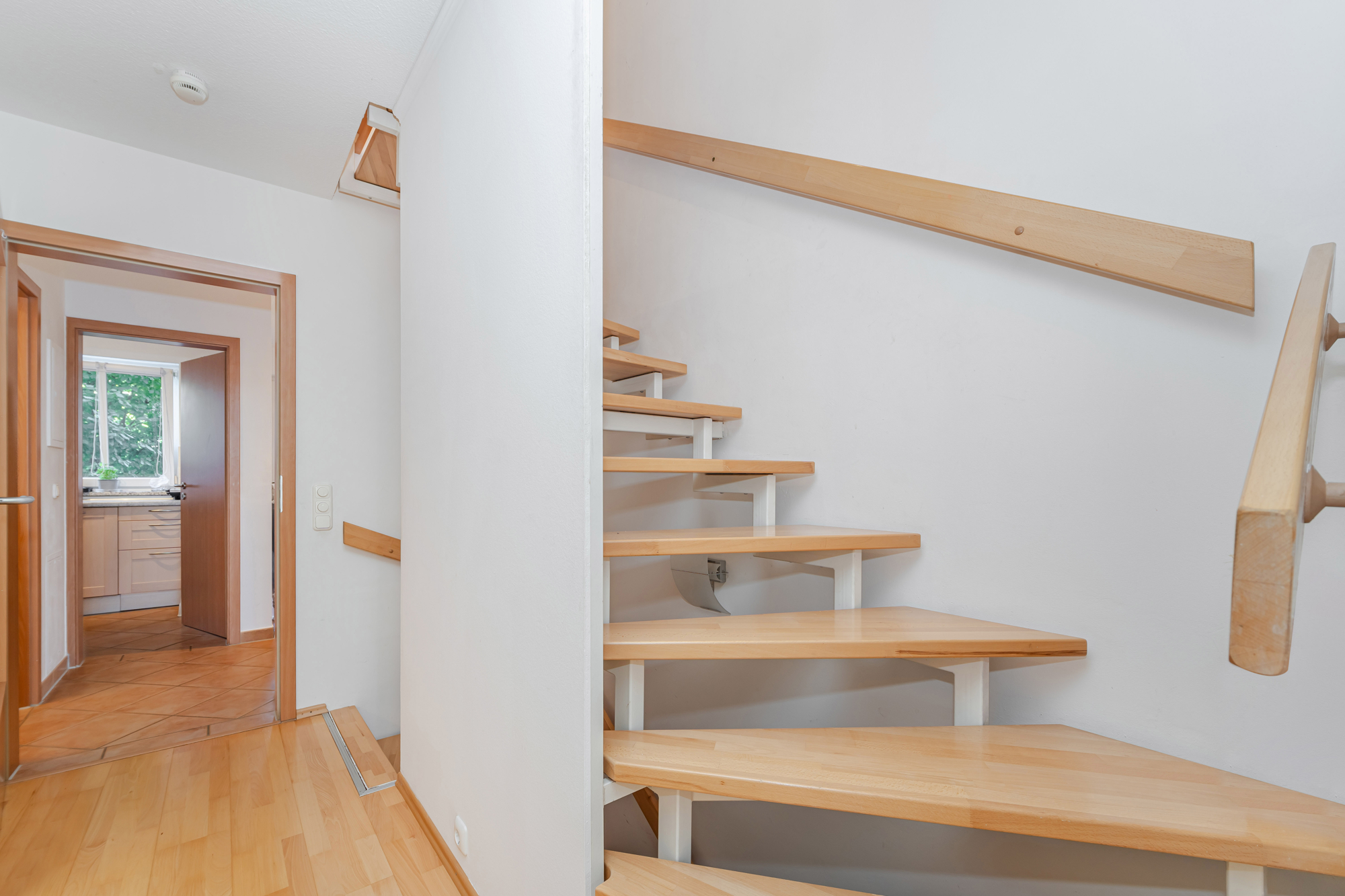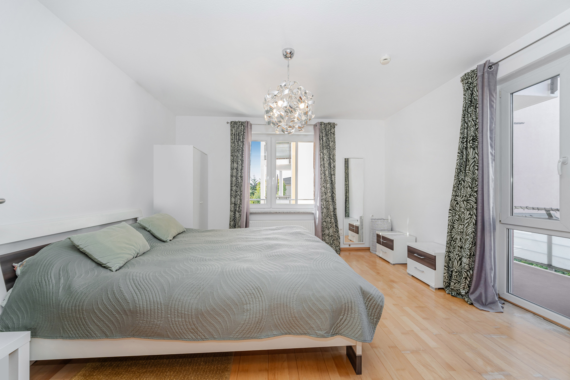 Über eine offene Treppe im Wohn-/Esszimmer gelangen Sie ins Obergeschoss. Hier erwartet Sie ein helles Schlafzimmer mit großen Fenstern und Zugang zum Balkon in Westausrichtung – der perfekte Platz, um den Feierabend bei Sonnenuntergang ausklingen zu lassen. Ein weiteres Zimmer steht Ihnen zur flexiblen Nutzung als Kinder-, Arbeits- oder Gästezimmer zur Verfügung. Das Badezimmer mit Badewanne und Waschmaschinenanschluss vervollständigt diese Etage.