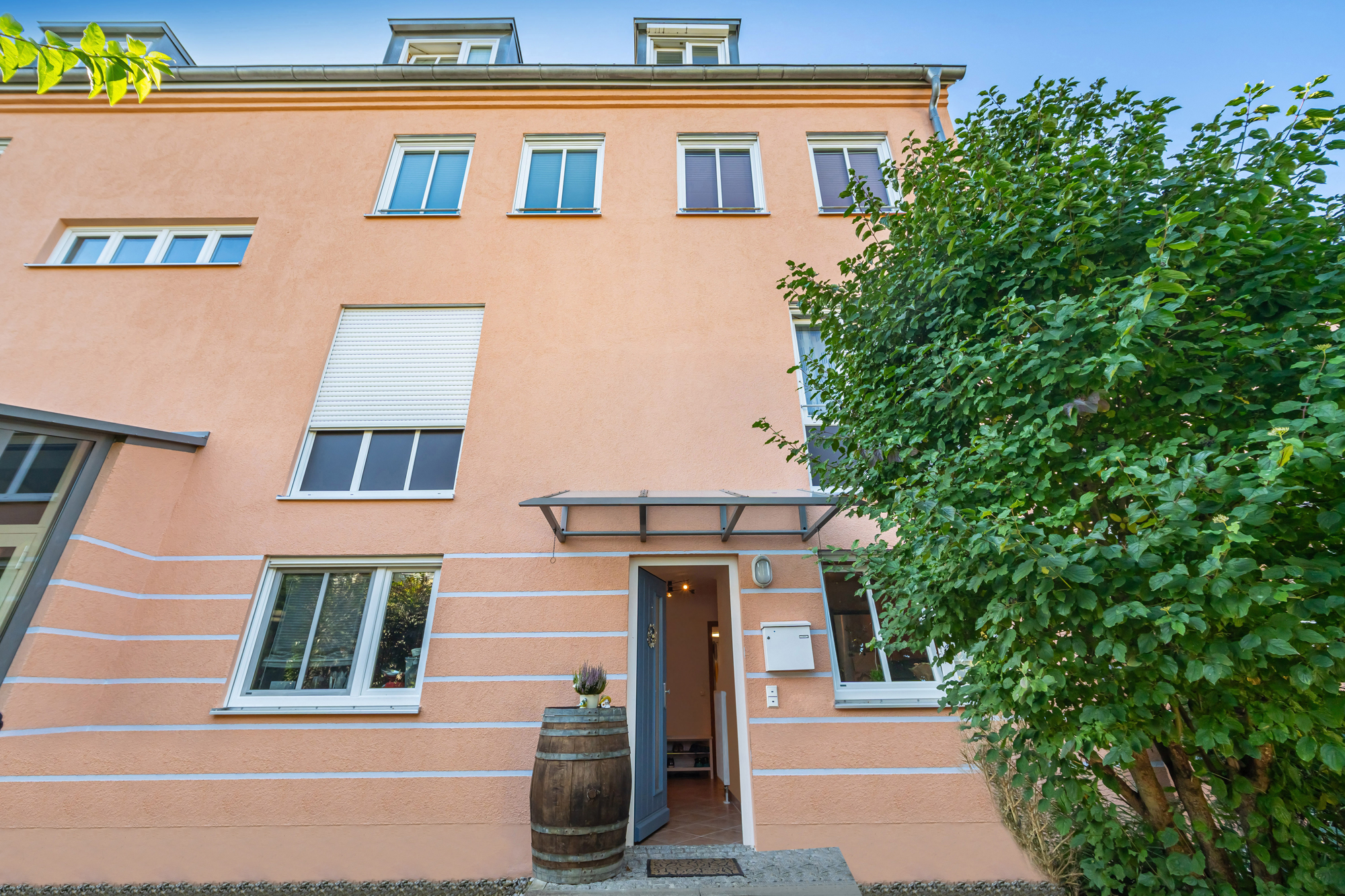 Über den eigenen, privaten Hauseingang betreten Sie das Erdgeschoss, das mit einem offenen Wohn- und Essbereich den Mittelpunkt der Wohnung bildet. Von hier aus gelangen Sie nahtlos auf die Westterrasse. Dieser gemütliche Außenbereich mit kleinem Teich lädt zu entspannten Stunden im Freien ein. Durch eine Passage zwischen zwei Gebäuden gelangen Sie zum zweiten Teil der Terrasse, der in sonniger Südausrichtung liegt. Hier ergänzt ein kleiner Garten mit praktischem Gartenhaus das Angebot – ideal zum Genießen, Gärtnern oder Verstauen. Eine separate Küche mit ausreichend Platz sowie ein Gäste-WC runden diese Ebene ab.